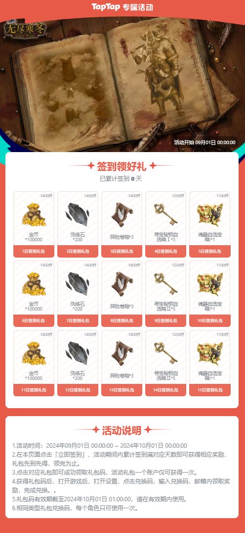 亲爱的领主大人,九月签到活动来啦~签到活动已于9月1日开启!【活动时间】2024-9-1 00:00 至 2024-9-30 23:59【活动详情】【参与方式】1、在活动期间点击签到礼包进入签到页,再点击下方的“签到”即可参与。2、获取礼包码后,进入游戏,打开设置,点击兑换码,输入兑换码,完成兑换。🎁快来参与签到赢好礼!