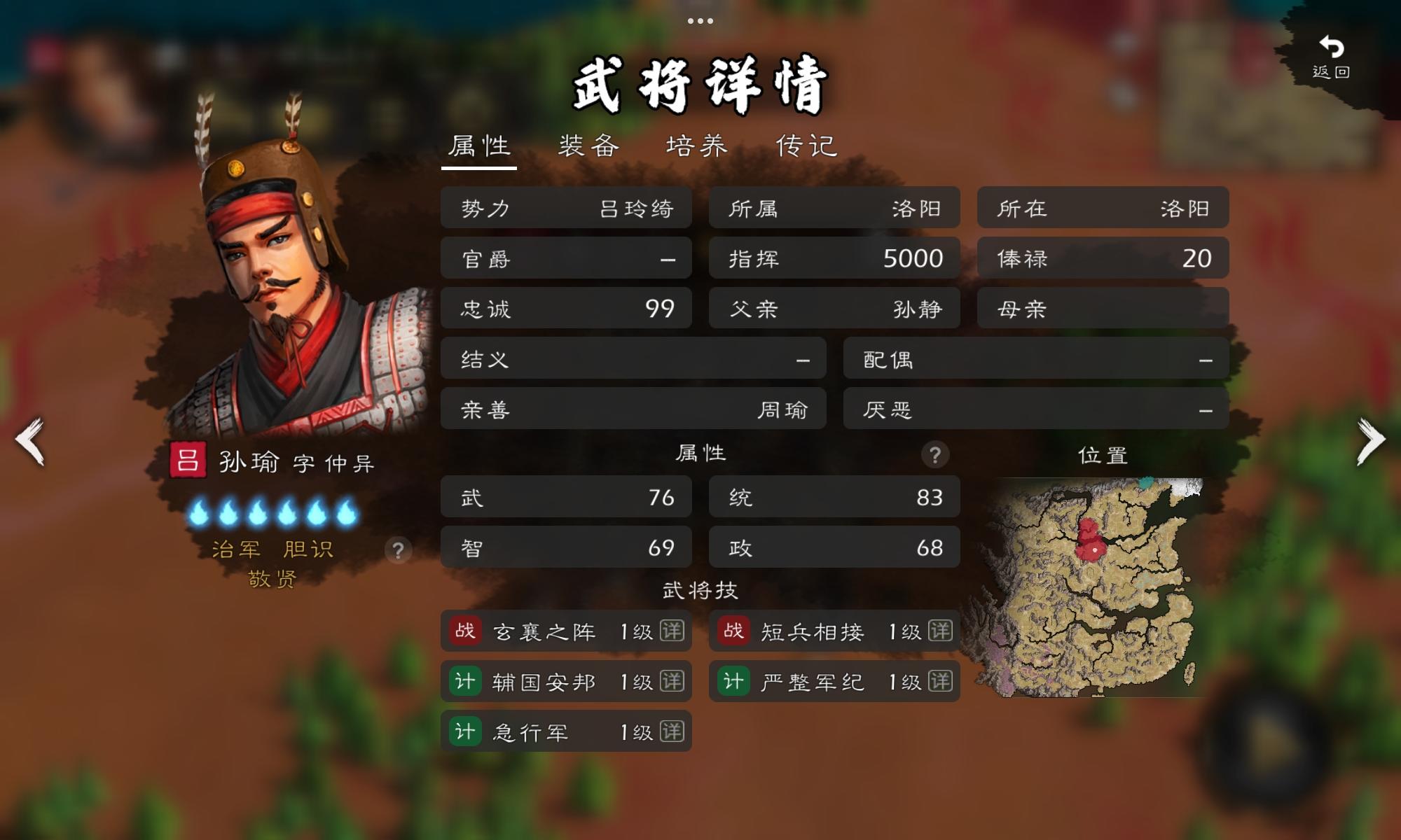 【图2】:加点、特性、兵种选择、技能选择 【图3】:培养——第40页,计策cd减少、耗蓝减少。 【图4】:装备选择——优先选择武将技伤害6%加成,其次就是堆智、统,如果运气好出了红色宝物技力值+2,那就无敌了 加点:优先智,其次统,增伤和减伤。 特性:通神+振奋+奇才+任意(最后一个位置自己搭配) 兵种选择:越肉越好,盾卫、藤甲兵、鲜卑铁骑,站得住就行。(我最喜欢鲜卑,肉的同时还有机动性,输出也不