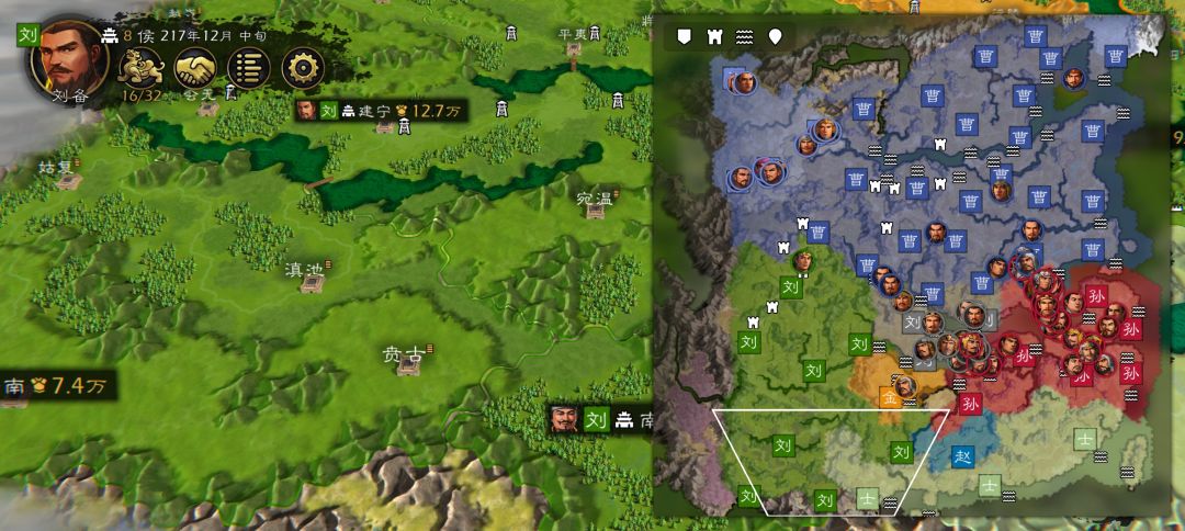 刘备这个势力作为开局大体来讲就是前期占空城防守,中期等剧情出兵灭曹,后期平推。第一回合出兵占空城任命太守,军师。军师有勤政减一回合研究科技,留4点虎符下回合点精舍,第三回合举荐用高智力的二回合出一个人才,然后建伐木场和田进入和平发育守城期。人才刷个高智力带聪慧的可以二回合探索一下,有探宝和登野将加成很好用前二次举荐选这个。 科技先点两精舍加虎符,再点军事加征兵的,再点内政庭尉府加治安的,治安也很重