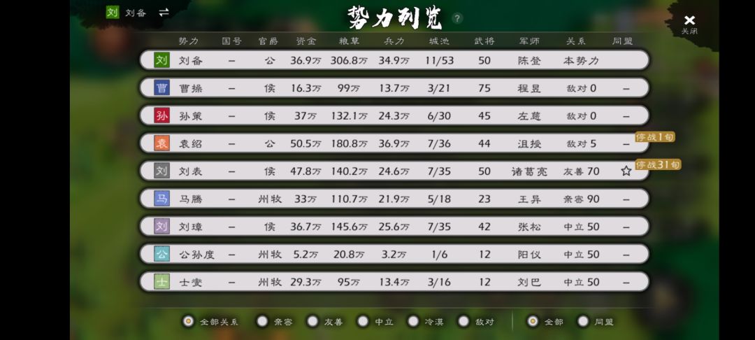 (官方剧本,困难开局,无自建人物,迷雾,史实,战死,寿命模式) 和电脑上的全面战争三国不同,逐鹿手游里面黄巾之乱是没有刘备势力的,所以选择了三国的第二个剧本诸侯讨董开局 可以看到刘备势力出生在平原,周围群雄环伺。发展不是很容易。 诸侯讨董剧本的特点是前期比较平稳,除刘虞,刘焉,张鲁,公孙度,刘表,士燮等要么偏远要么进取心不足的诸侯之外,其他诸侯都形成了讨董联盟,对董卓势力是敌对。 如果开了史实剧情