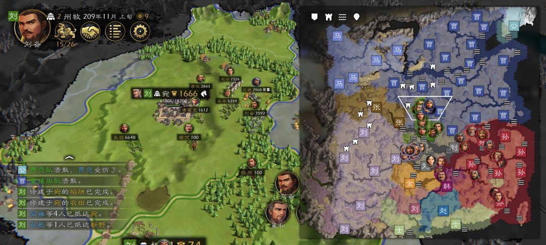 开局刘备,难度挑战➕迷雾,真实武将,无自创 209年攻下宛城破局,讲讲心德。 本人从霸王大陆开始玩三国,已经有30年的游龄了,以前光荣每个版本的三国都花了不少时间,随着年龄增大玩游戏的时间也不多,现在就偶尔玩玩,国内三国只要是买断机制的都会支持一下作者,本作从创新上来讲的确没有什么创新,也不做什么横向对比了。 一、难度分析。 开局选刘备,难点在于在曹操身边,容易被大几万的兵攻打,而且挑战难度电