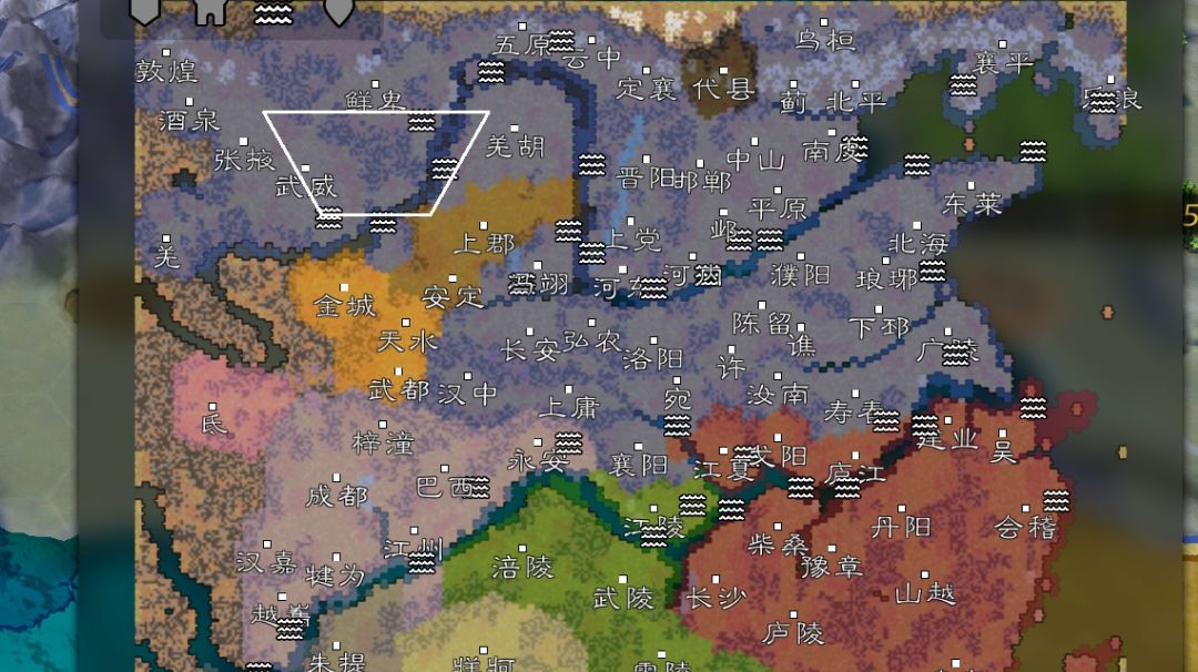 自己搜百度中东汉末年的地图和人口,以州为单位大概每100万人口建一个城,城池名称除了洛阳长安特殊,以及少数两百万级的大郡以外都是汉末郡名,偷懒没有建小城。 查了交州凉州并州都是总人口不满百万的,只按照州名建城,但是交趾郡好像没有数据所以单独再建城。 汉末的主要异族势力也建了城。 只有平地、海洋、森林、道路、桥梁、港口,看了看应该不影响商路以外的内容。 这个地图应该可以更好的反应汉末的实际情况了。