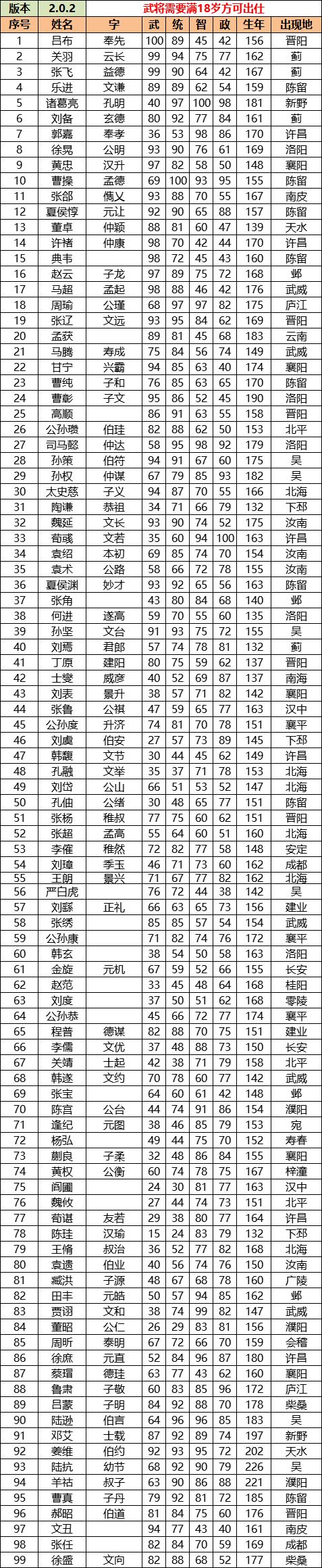 这次按照自建武将初始99培养页整理