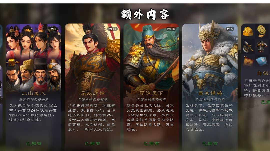 如果跟我一样不喜欢开虚拟武将,又想玩全史实战国楚汉武将得话,首先得先买那个自创地图,然后新建地图进去选加入系统地图,把时间拉到最后,再自己创建些势力,然后把所有武将都推荐分配了就可以玩到全部战国楚汉几百个全武将了