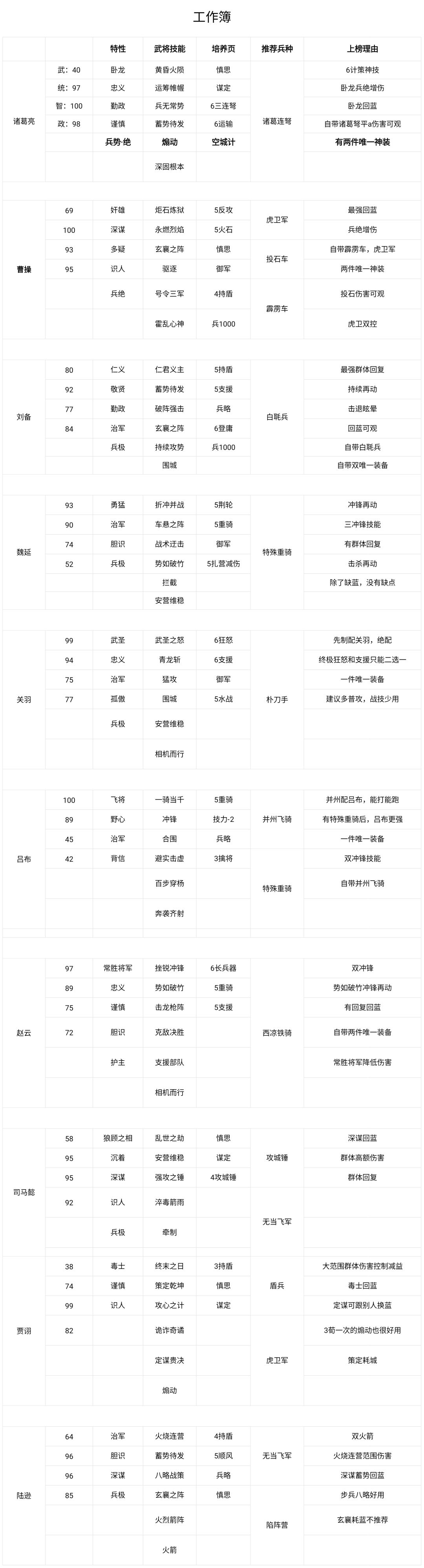 第一次学着做表,做着玩玩[表情_微笑],能看的清楚就行了[表情_斜眼笑]。 关于武将强度方面,可能后面的贾诩和陆逊会有些争议吧,这两个也都有自己的特色,没办法,谁让法师确实是很强。 还有关羽,在朴刀手没有加先制之前确实是不算T0,但有了先制,就一定程度上解决了身板脆的问题了,上T0没问题的。 武将篇就到这里了,后面有时间就把所有适合做太守的都找出来吧,兄弟们晚安💤
