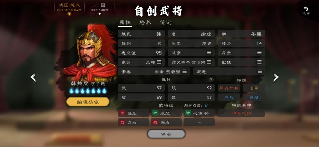 此自建角色仅“逐鹿”战国剧本可用 话不多说,直接上图。 釜底抽薪、循环无端、天问。 三个计策缺一不可。 像这种技能天赋树的搭配可以闲时为太守,战时出来使用“永动”大法。(我总共建了12个) 其实,“永动”自建角色在天赋树的选择上只要有“慎思”就足够了,而且开局就可以拉出来相互刷等级,直到两名(以上)同款“永动”自建角色把“慎思”点上才能达到“永动”效果。 接下来是攻城自建武将 核心战法、计策:摧城