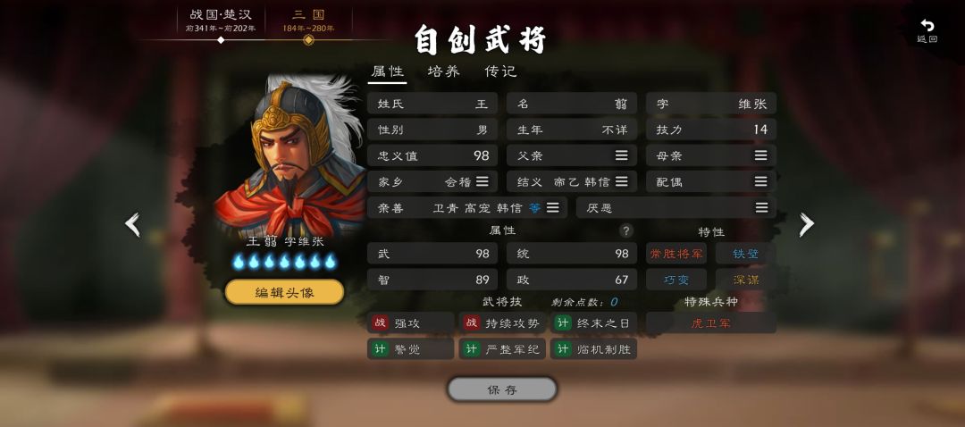 作为装兵容器,目前版本的三国自建中,虎卫将领无疑是综合强度最高的一档,本贴旨在探讨自建虎卫的各种流派。可能一次写不完,会慢慢更新及补完错漏,欢迎讨论。 一、基本思路 个人看法,这游自建武将考虑内容大抵包括:操作流畅度、硬度、攻击力、回蓝、回兵、士气、防伪报禁言、连动、技能普适性、天赋页适配以及不易被俘和战死等。 二、兵种解析 虎卫兵种优势: ①亲卫,自带士气,可省1个特性。 ②持盾,不怕弓