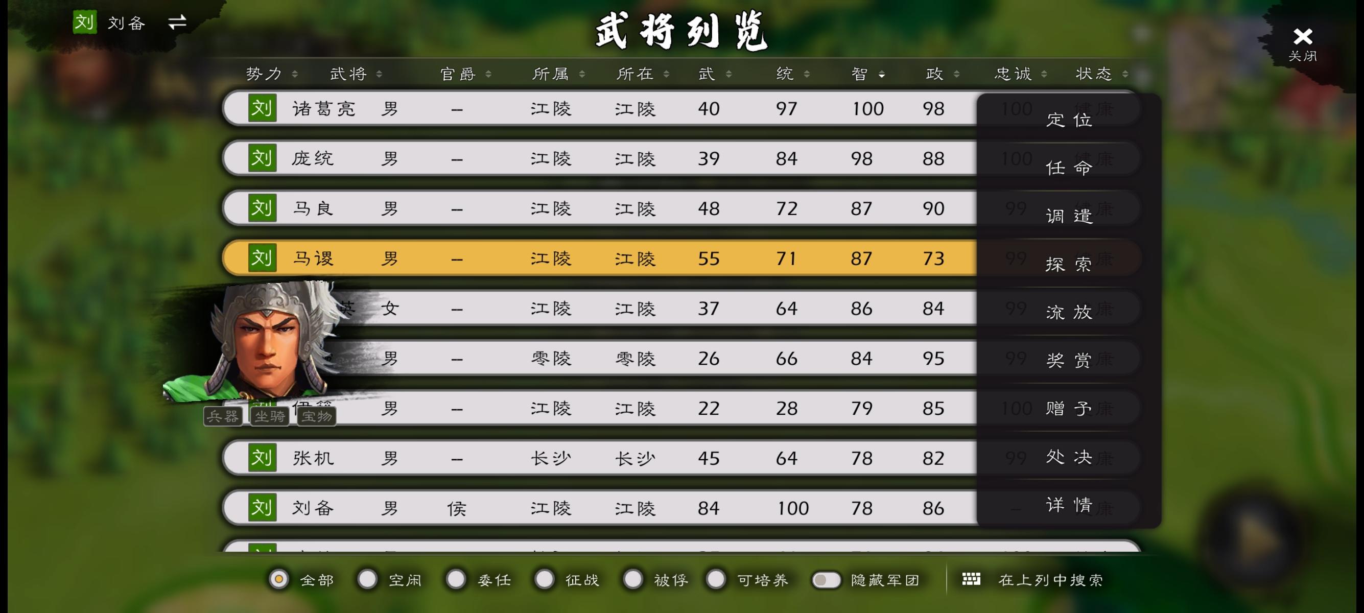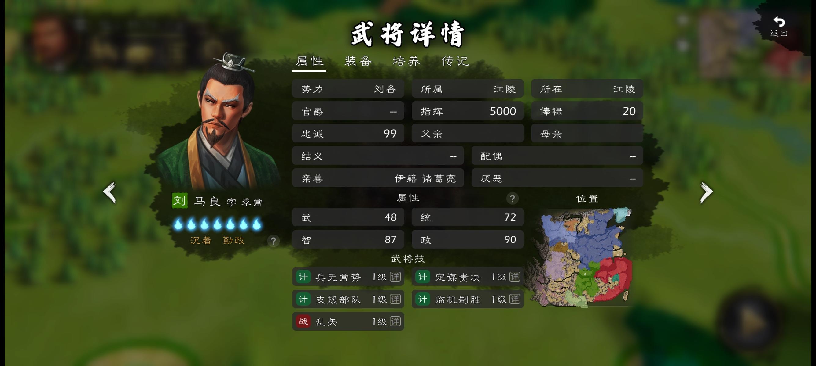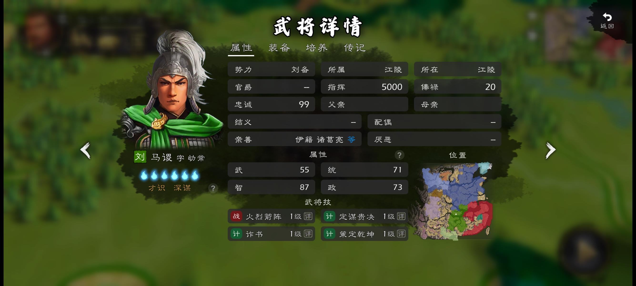 阿心,马谡那么有话题性的人物,他的立绘太普通了,仿佛是个普通小将似的。能不能强度调整一点点不用太强,或者把策定乾坤改别的干扰技能,本身带弓箭兵种,又加策定乾坤,使用起来又不顺手了,定位不要让他去攻城,在后排打干扰或者辅助就行,也符合历史人物特性,不然被城池攻击很伤的。重点是立绘改一下呗,连刘谌都有单独立绘了,马谡给一个不过分吧,荆州刘备开局,智力排前四,一点开头像,却像个大众脸一样