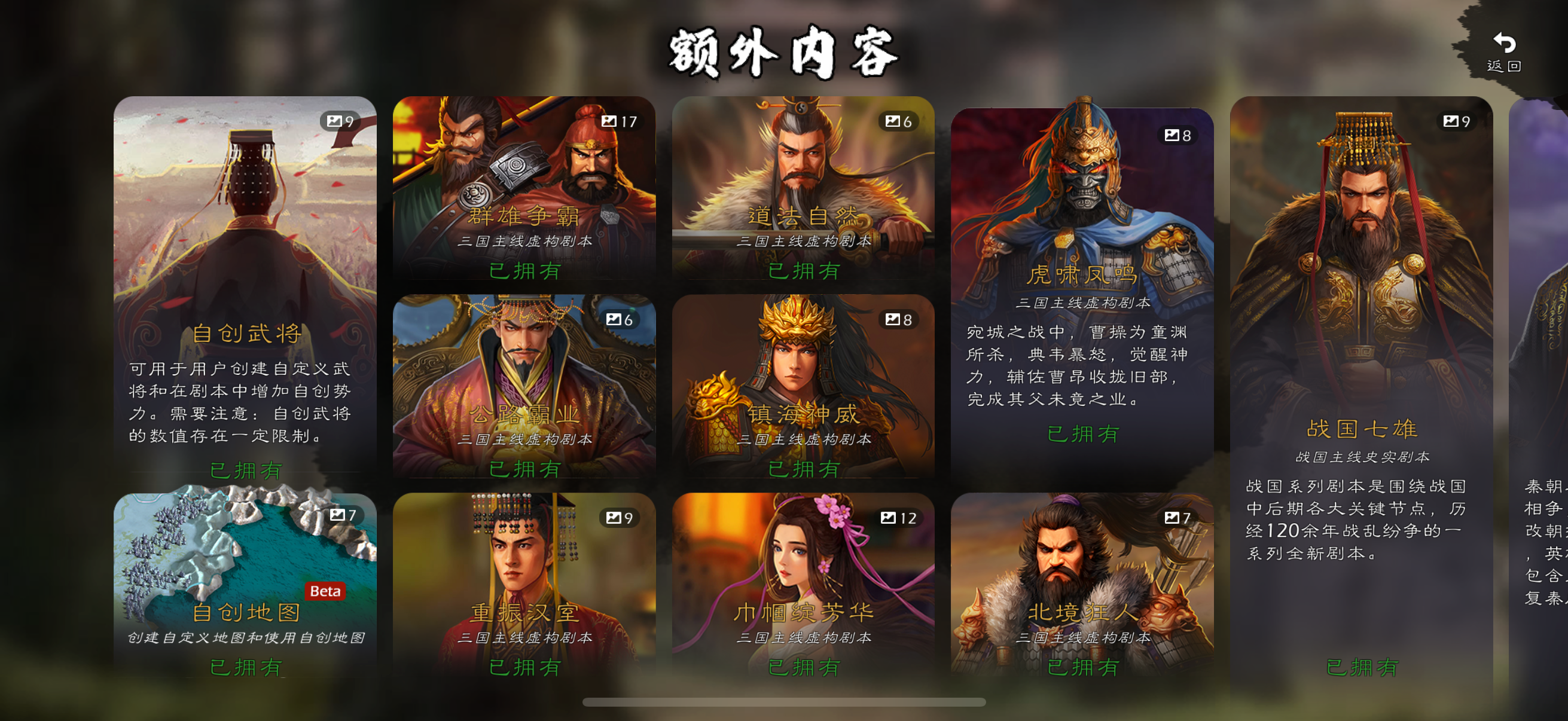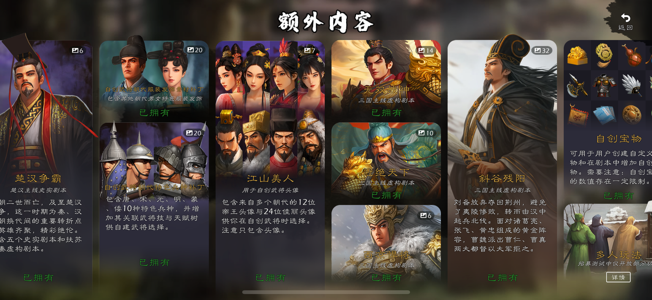 逐鹿作为国内手机中唯一能替代PC三国志的游戏,没有那些抽卡式的db玩法,还是一款非常值得推荐的游戏,相关的dlc也第一时间全部支持! 近期官方的几个更新也非常给力!玩了500多个小时,还是有几个建议:1、三国与战国的技能和人物能否互通。自己买了战国,但真没完整玩过一次战国,自建武将都在三国里,不想一个个再重新弄。2、未来可以多出一些历史名将dlc:战国、隋唐等。如神将版的项羽。3、购买后的