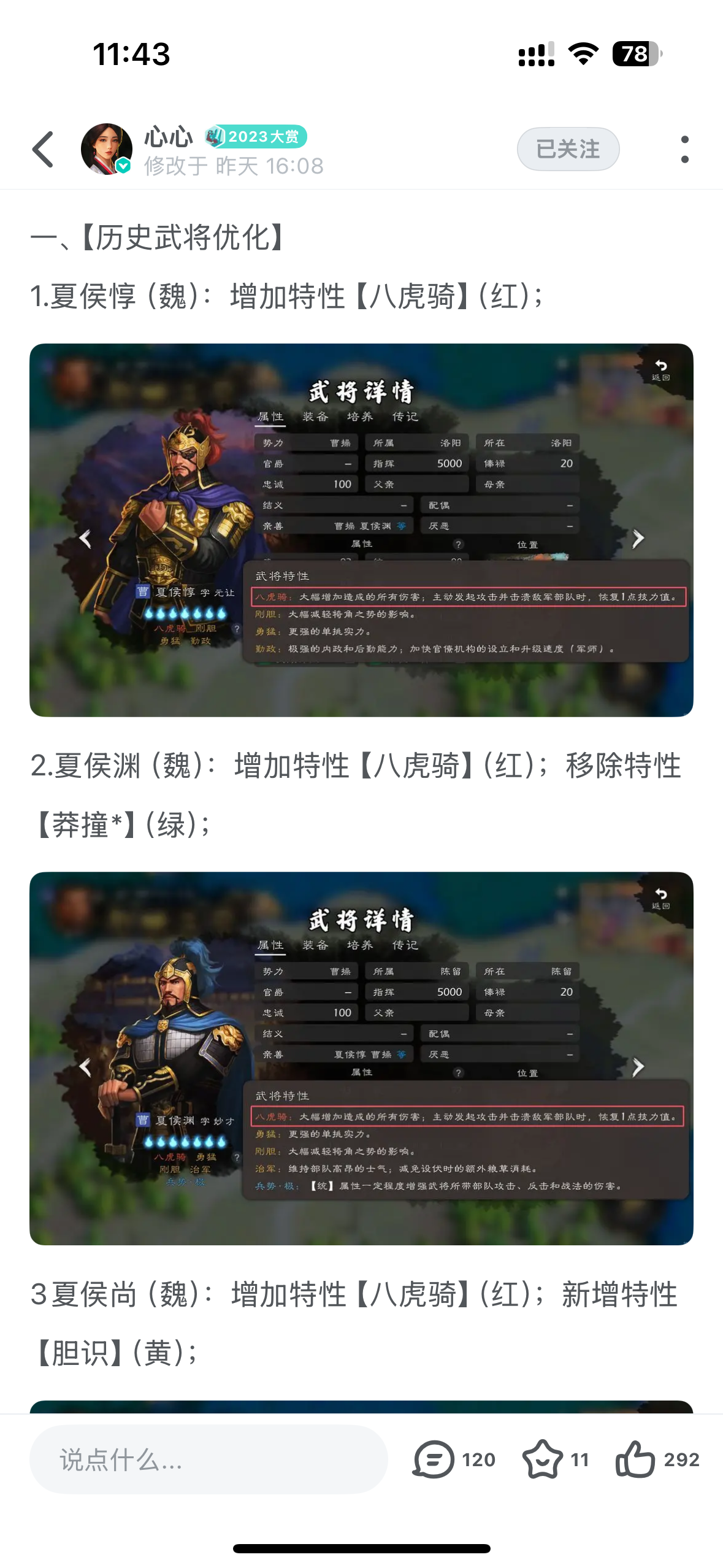 曹仁2个大幅增加伤害,虎豹神威又全部在动,2在动就是魏延加2个大幅提升伤害啊,还有夏侯渊张合伤害怕是高得可怕,这样显得关羽赵云居然没有加伤尴尬得要命,八虎骑直接增加造成的伤害就够了,这样就平衡不用再去加强五虎,不然你不加强五虎和周瑜陆逊那就不平衡,但是你在加强就和楚汉一样了,厉害的太厉害菜的又完全没用以前拿个刘璋势力,蜀二代东吴哪里2流人物,或者三流势力还能用一下,你这样一加强直接垃圾桶了搞得就只