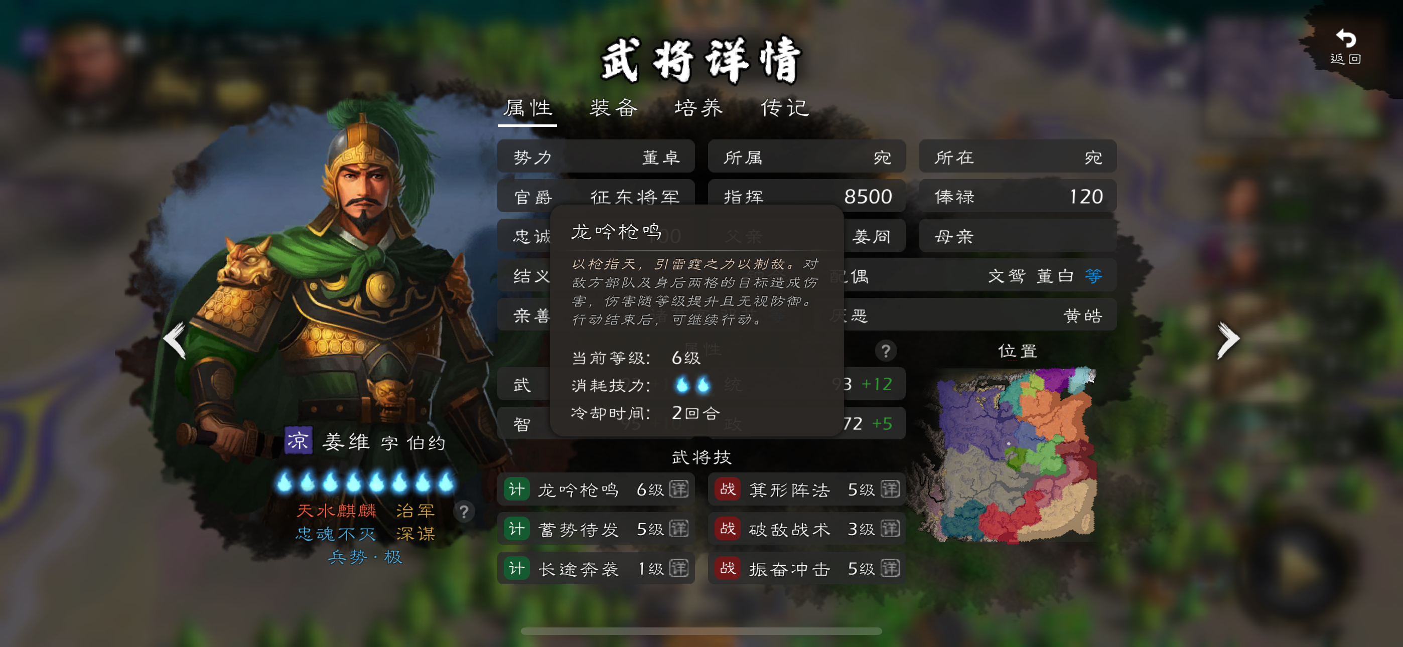 3.1.19版本目前最优自建法师,不需要额外特殊兵种DLC更多自建武将请移步(持续更新)特性两个超级性价比的蓝色特性【任侠】42%高额增伤(之前更新出现bug,计策也算进兵种增伤里,不改就是机制,晚上发版主看不到),还有45%的高额免伤,又有伤害又有坦度。【鬼才】13%增伤以及技能概率免冷却,总共60%的增伤,够用且伤害不溢出。(下图,满级【龙吟枪鸣】对飞熊军的伤害是8497,飞熊军6