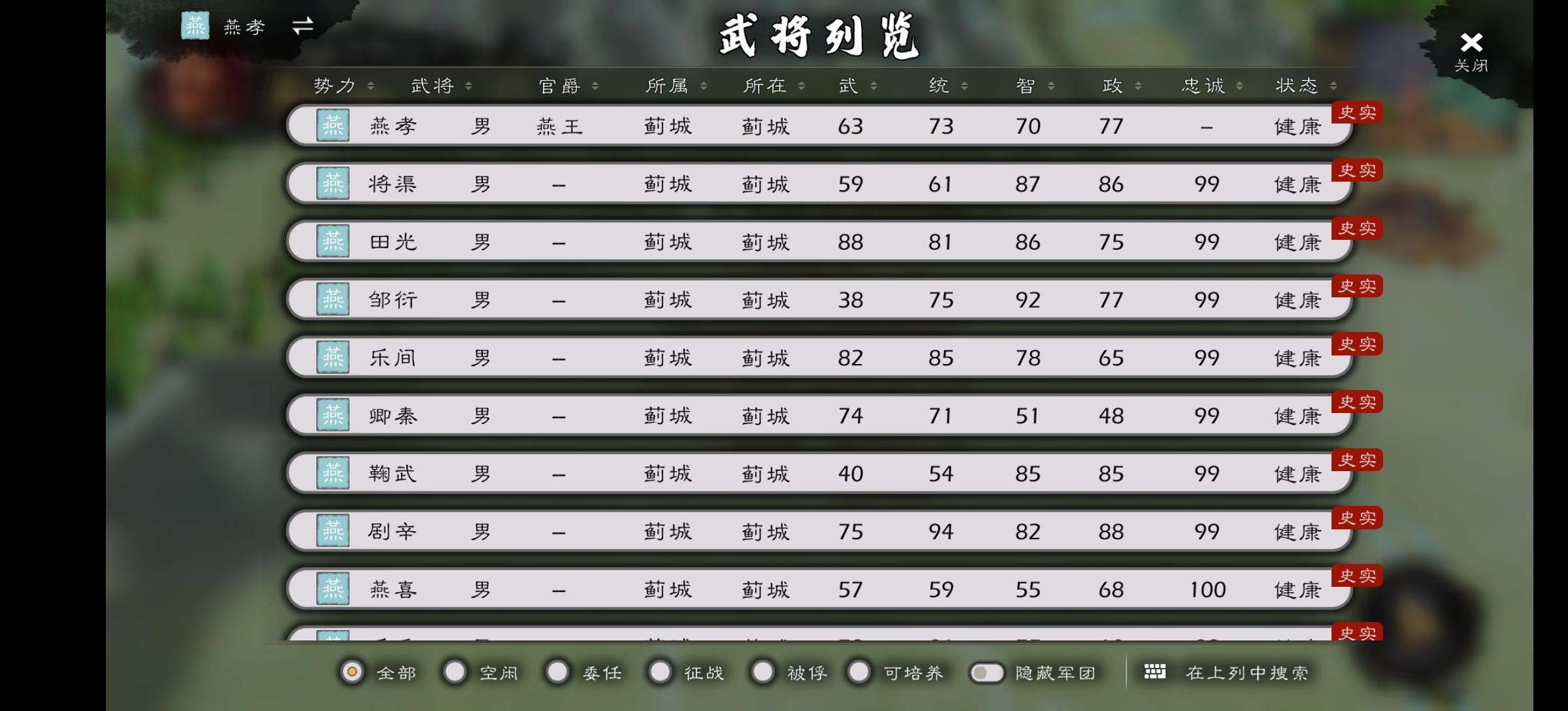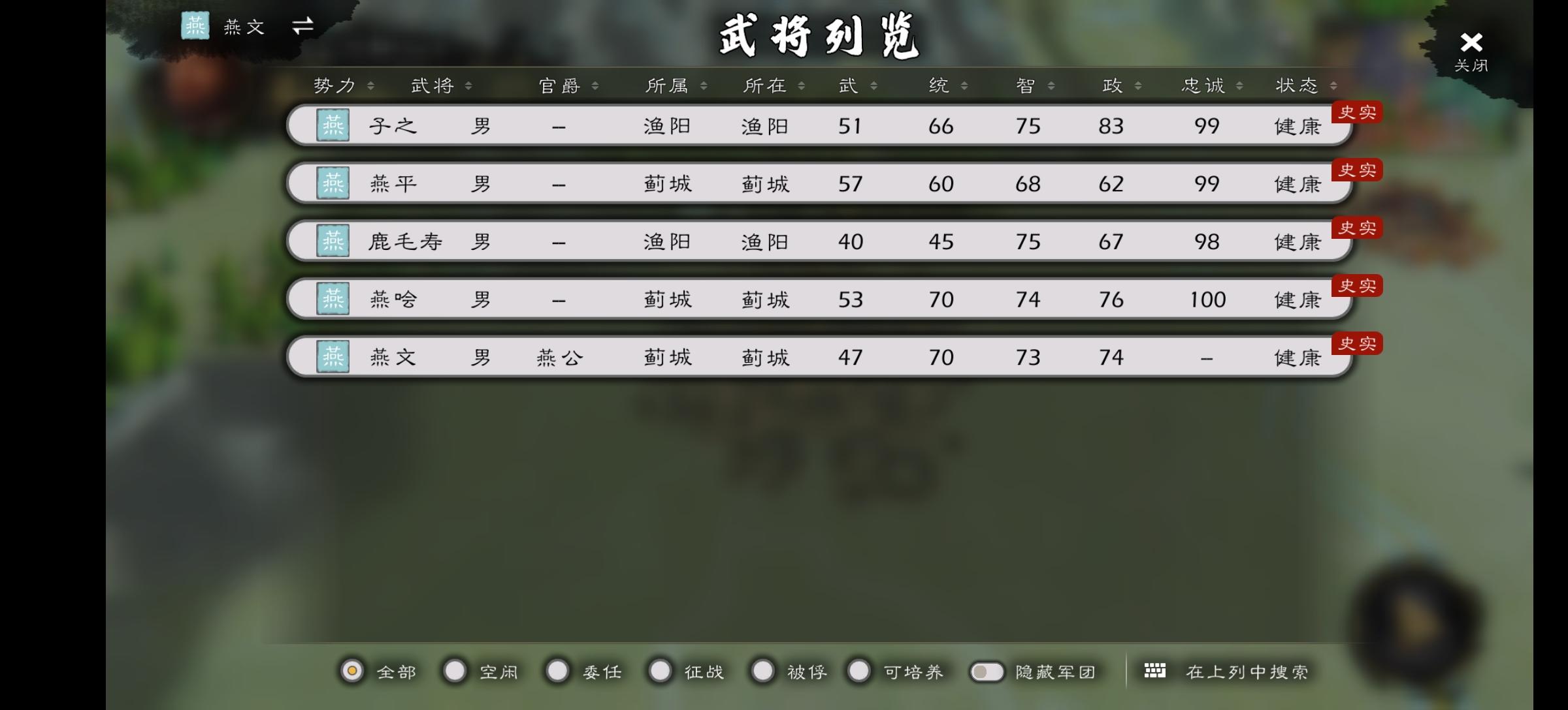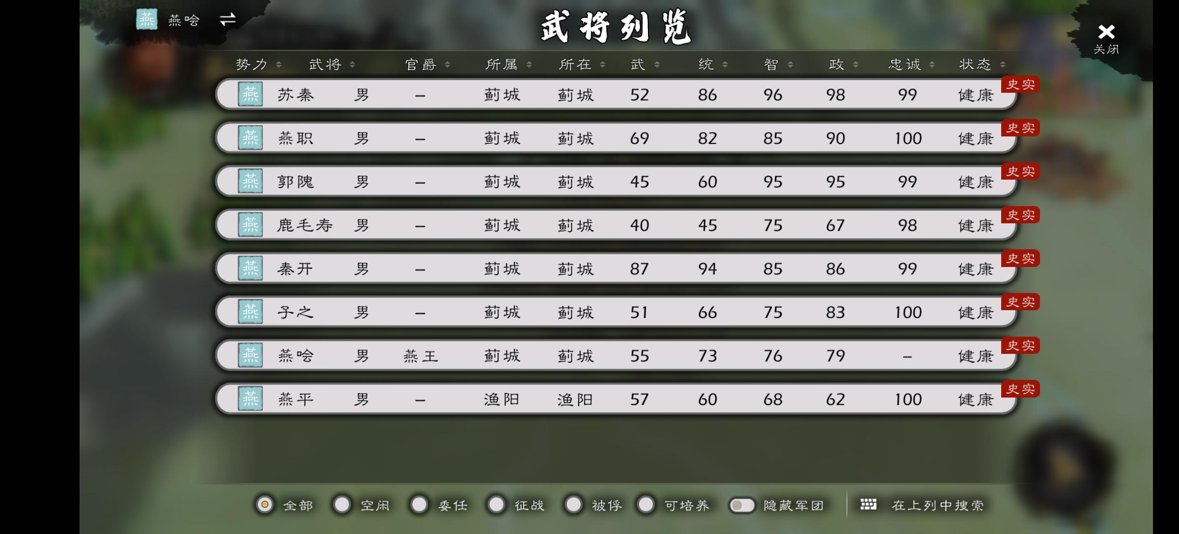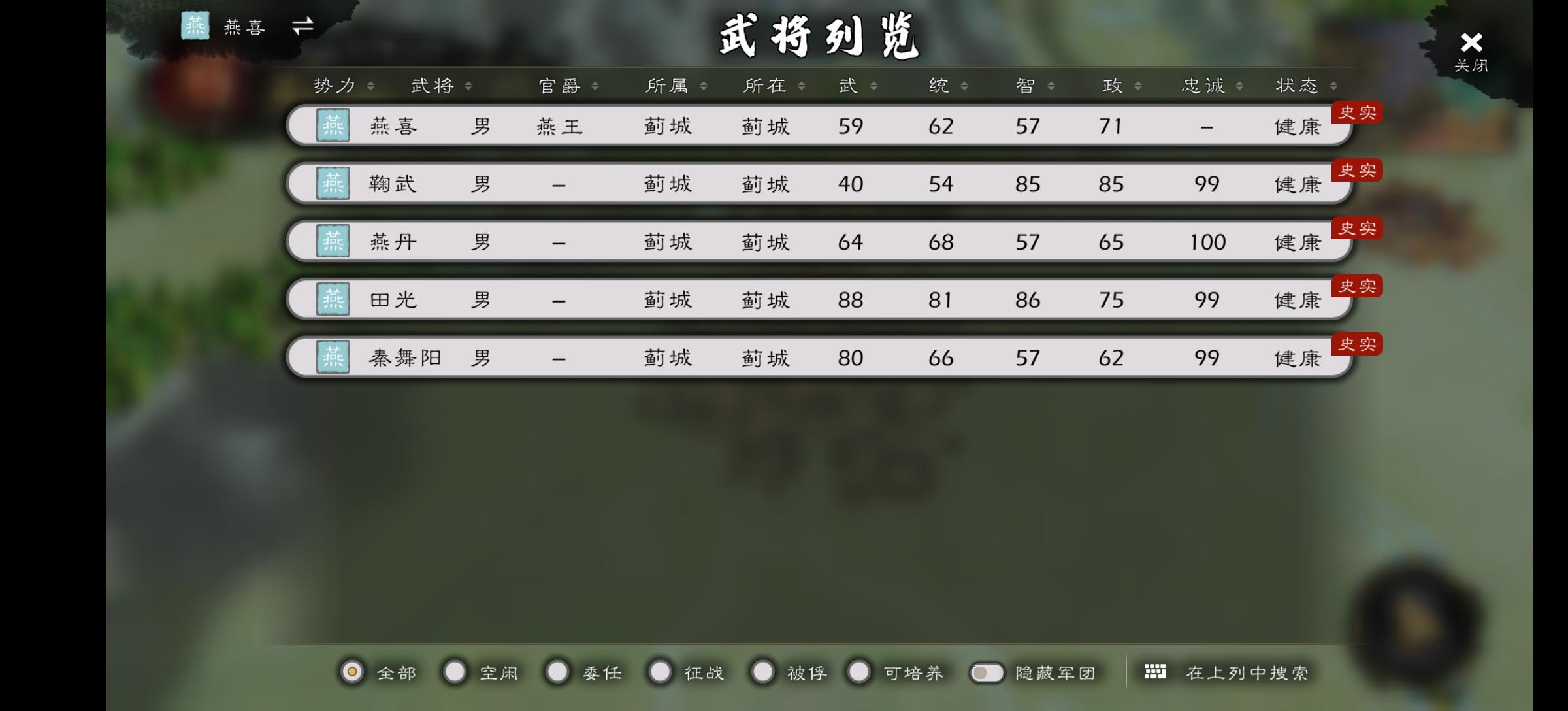 燕文时期 燕易(游戏采取了燕易王就是燕王哙的设定,但是绝大部分史料记载这俩不是同一人,燕易王病逝传位于燕王哙,燕王哙则是兵变被杀,燕易王是燕文侯之子,燕王哙之父,在位时间是前333年至前321年。) 燕升(姬升,燕易王长子,燕易王死后与燕哙争位,失败后逃到辽东东梁河阳,弃姬改鞠,后太子丹的老师燕太傅鞠武是其曾孙。)燕职时期 燕襄安(名不详,受封襄安君,故名之,燕昭王之弟,前300年左右被派