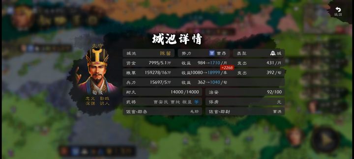 关妹妹强吗?刚刚好,因为极限难度人机像蚂蚁一样多,有用不完的钱,如果不够强何年何月能统一?我玩这种游戏有强迫症,必须最高难度,必须统一,要不然不舒服,有点后悔没带大量自建了,有自建我就不会这么累了,自建就带了个画饼王的国师,防止被挖墙脚,但即便如此依然被挖了不少,一回合+2忠诚度也可以被挖墙脚??有点离谱了!陆逊被我抓来了,野战能力一般吧,他是突然从城里出来秒了我一堆人,我还以为有多强,就是个肾