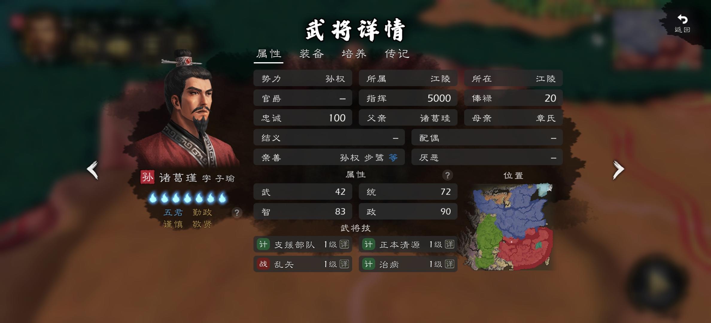 神诸葛瑾 字子瑜 初始火条8.(天赋无火条增幅)天赋培养有谋定(减计策冷却)慎思(减计策蓝耗)。以及统智政增幅。辅天赋游说和登庸加成。四维:武43统73智85政90特性:专属红词,三思笃行:有较高几率识破自身和周围友方伪报和牵制异常的状态。使用计策战法有概率不消耗蓝量且有极低概率不计入冷却。增加自身兵种的免伤。移除黄色词条五君。专属黄词,神交:增加游说敌方武将的几率(受敌方词条影响)。擅长说