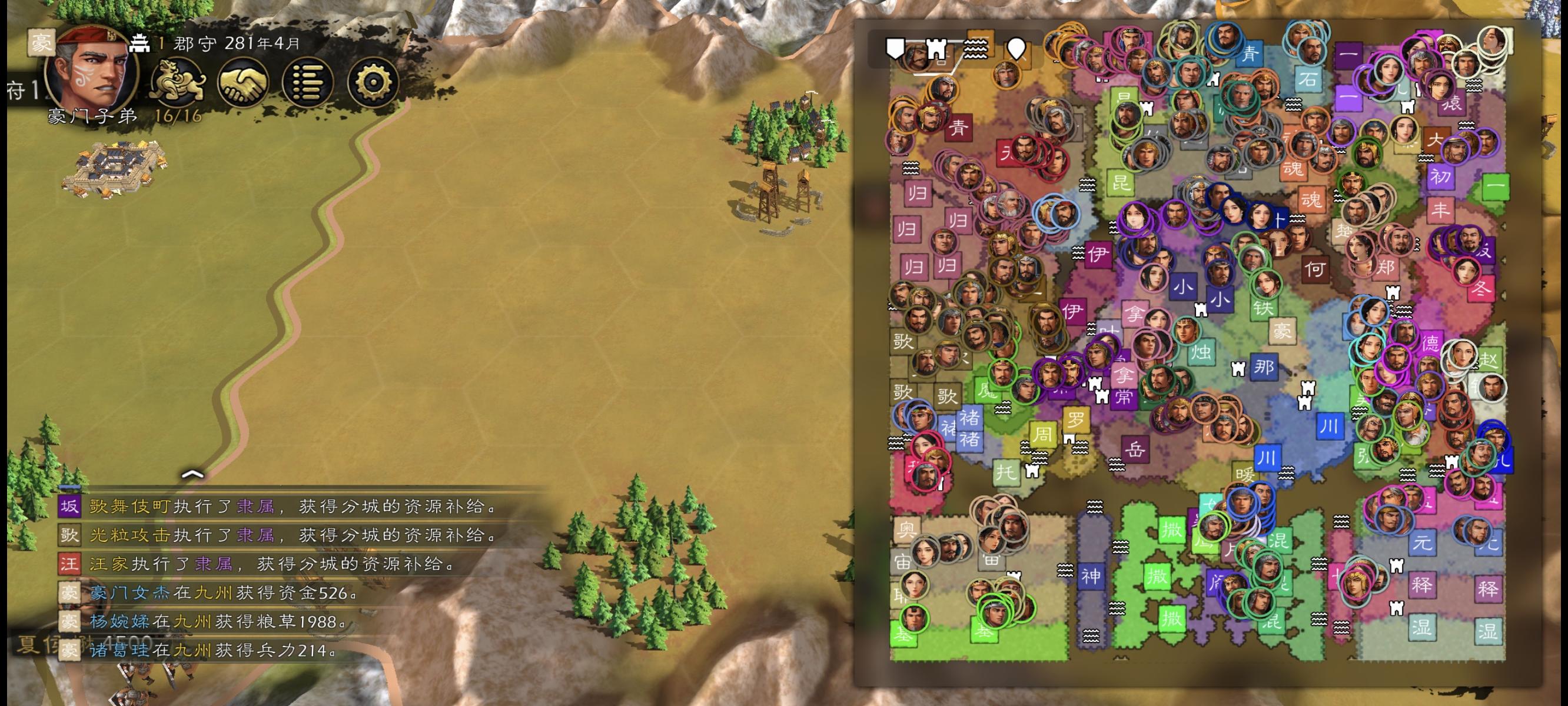 目前因为测试时间太短太赶,自己去正式玩了,才发现还有很多问题。比如中心城市太空旷,而一圈地图都是密密麻麻人头打架,君主几乎都是奸雄野心,太过活跃;自建数值很高,给的ai势力太多;即使神吕布,神马超都能ai被打爆我想把地图城市范围缩小,加更多城府,避免跑路太远