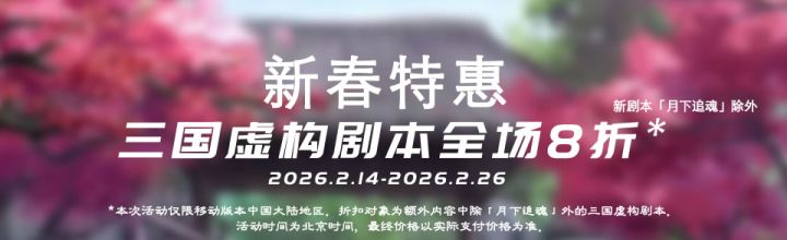 亲爱的各位主公:马年启新程,年味意正浓!值此2026马年新春佳节来临之际,为回馈广大玩家一直以来的支持与喜爱,特推出三国虚构剧本限时8折特惠活动(不含月下追魂),邀你沉浸式解锁三国乱世风云,共度新春喜乐时光~【活动时间】2026年2月14日 - 2026年2月26日【特惠范围】本次8折特惠覆盖以下三国虚构剧本,具体包含:群雄争霸、公路霸业、重振汉室、道法自然、镇海神威、巾帼绽芳华、虎啸凤鸣、