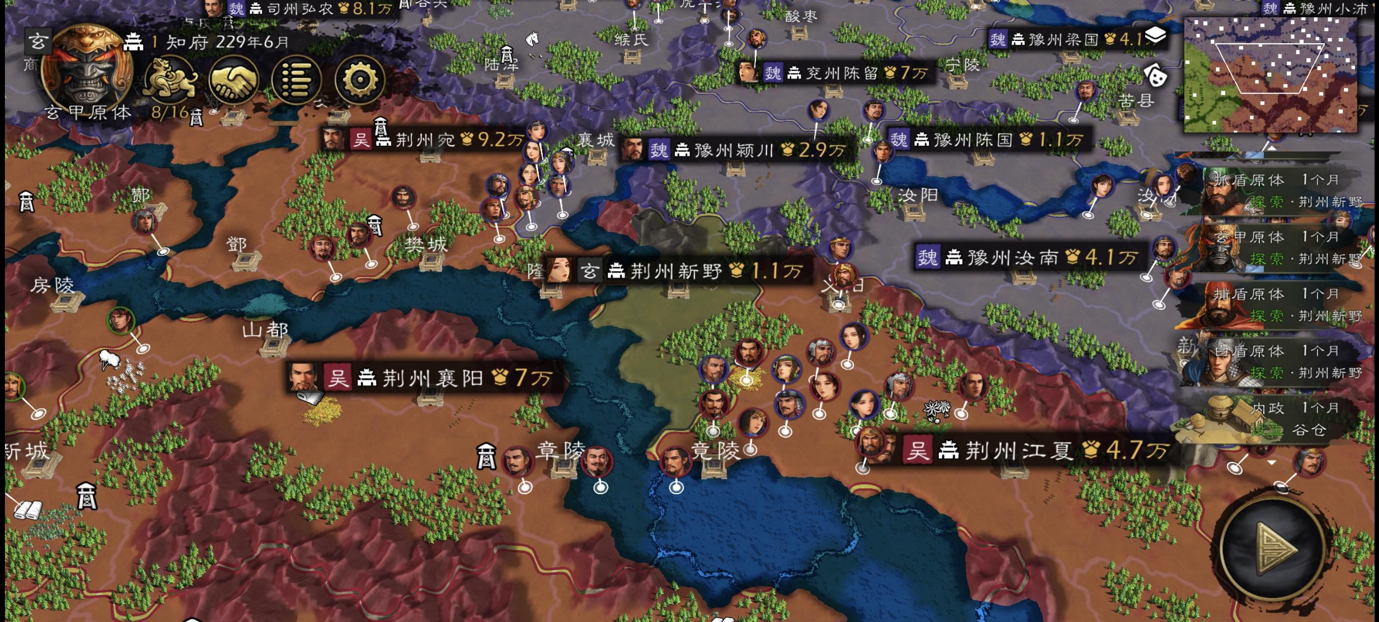如图所示,我自建新野小城开局,曹老板和鼠辈宁愿划江而战也不来推我,极限宝宝难度?