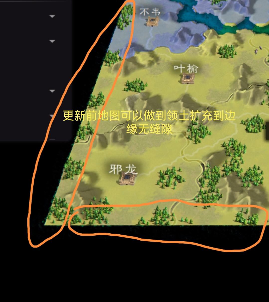 #心心 自建地图的问题,老心来瞅一瞅看一看图1是更新前,城池领土扩充到地图边缘可以做到无缝隙图2是更新后,城池扩充地图到边缘位置就会出现缝隙,怎么填都填不上的那种。图3就是两种在小地图上的效果图,那种领土无法扩充到边缘的在小地图上就会有一条白色边缘显示,很难看。能不能改回来