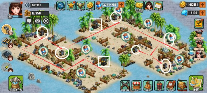 军火岛的全开图,与箱子与钥匙分布图。附带路线。每个图的小钥匙不一定要全捡,够开大箱子就行了。当然能量多的可以多捡,活动结束后钥匙能留到下一轮不会消失。方形是大箱子每图2个,每个需要钥匙3把。圆形是小箱子每图6个,其中海岛有7个(下面路线第一个门口第一个箱子漏了圈起来),直接打开。多谢指出的大佬。补充了第7.8图各一个之前遗漏了的小箱子。