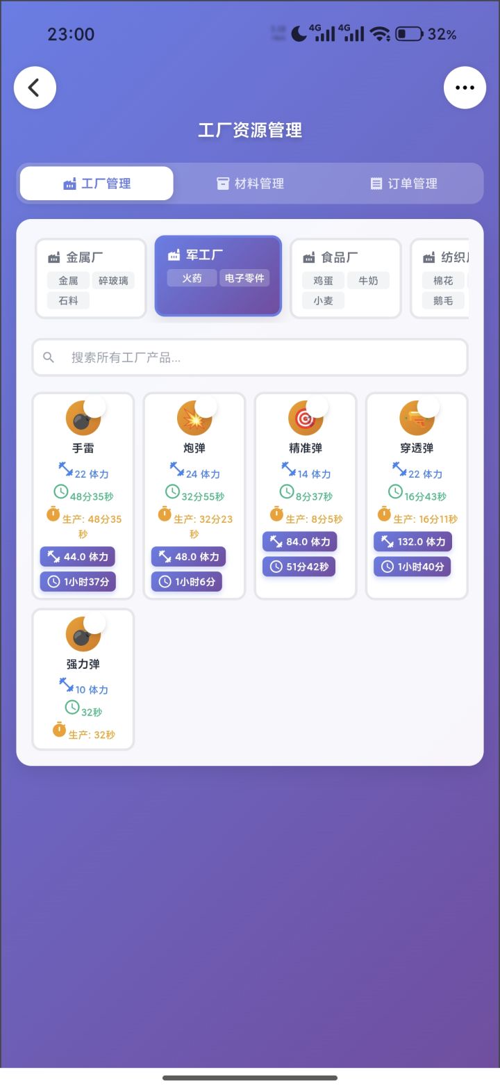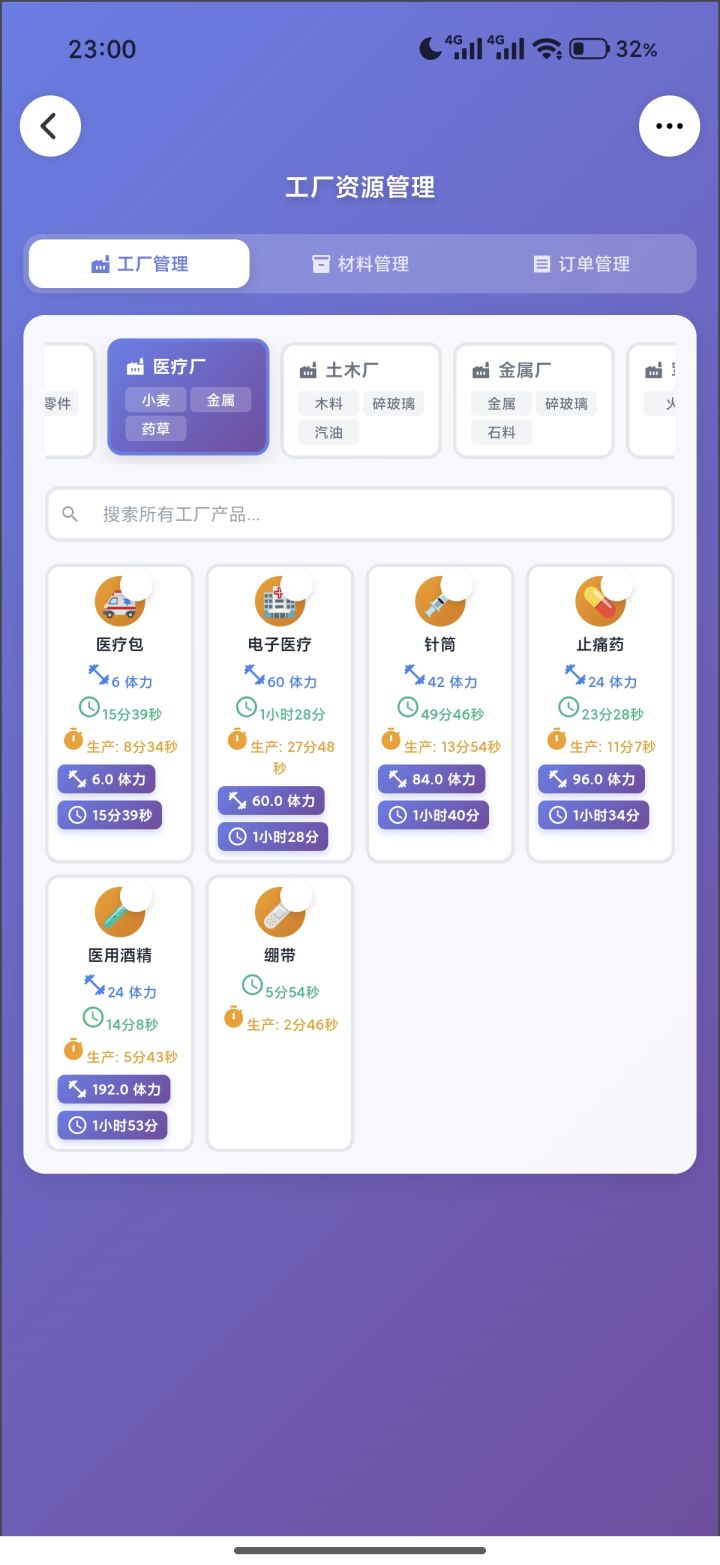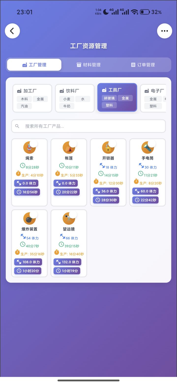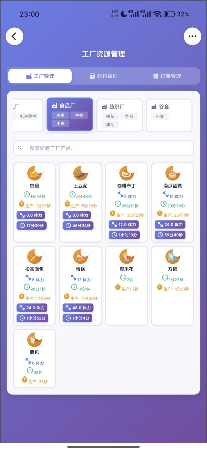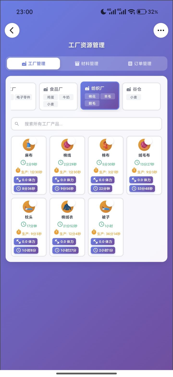 手戳了一个灵光应用录进去数据跑了一下,自己看图吧。每个产品下面加粗的,是平均单订单该产品的体力成本和时间成本。(可能有少部分数据会录错)前置信息:这个游戏订单交的越快,升级越快,锤子越多,科技越高。锤子很重要,所以工厂一定是优先围绕着订单数量再兼顾质量的的。结论:材料多,选时间少的,材料不够,选体力少的。中间还有些材料平衡就自己看吧。重点:纺织☞无脑麻布棉线,量足够了随便造别的,原因看九