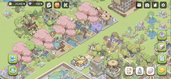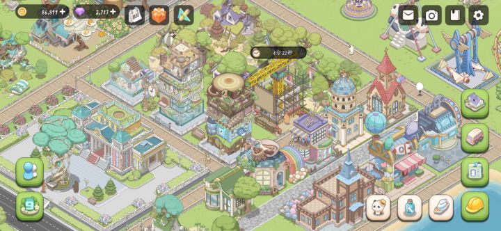 画风真的很可爱,能感觉出来游戏开发者超级大的脑洞,等级不够没建造的厂子都用树木包裹起来,但是我觉得看着有点乱,如果正式服可以把他们加个描边或者重点色之类的能让我把这些建筑和我已经建好的明显区分开看着会更整洁一些。建造住所的时候也很有特色,每个小动物住的楼层都是不一样的装饰,比如蜗牛的大门是一个蜗牛壳,犀牛的楼层全是水。但是对我这种有点强迫症的看着会有点小乱,总感觉这个楼摇摇欲坠哈哈哈,左上角的紫