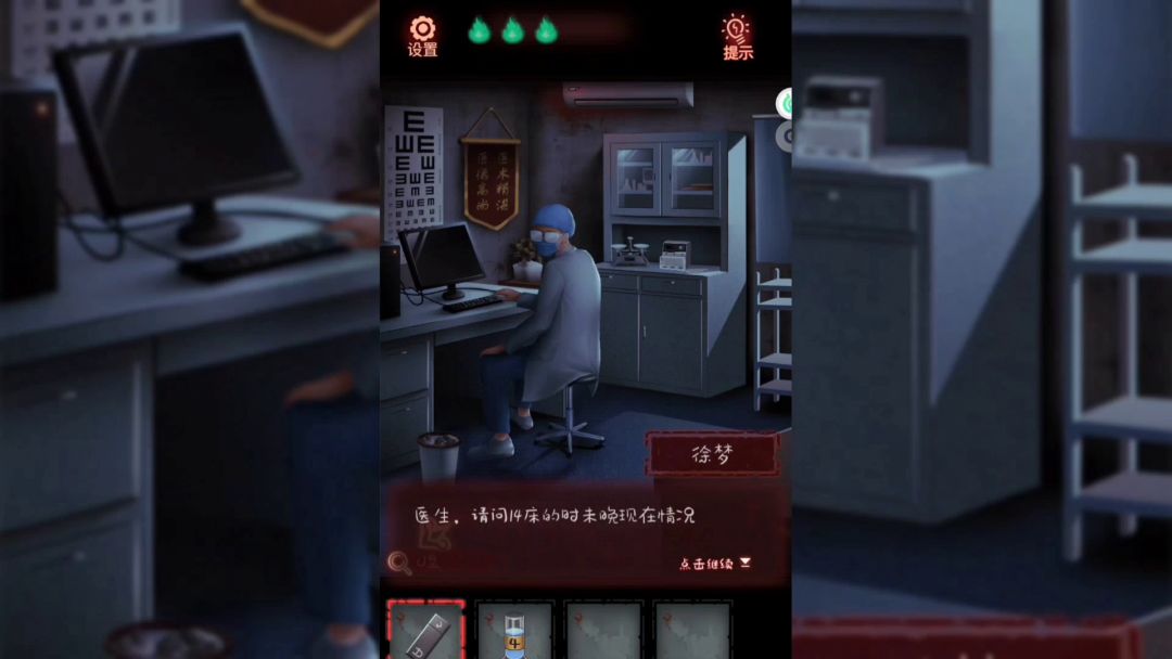 第五章:梦梦救我 1.(404病房)点击显示屏,获得线索:需要特效药 2.在床头柜上获得【5克砝码】 3.点击床头柜,在下方抽屉获得【紫外线灯管】 4.点击时未晚,触发剧情,在盒子中获得【婚戒(女)】 5.(走廊)把【紫外线灯管】放入墙上的灯槽 6.点击查看墙上的图案,根据护士站柜子柜壁上的顺序,得出符号顺序(上面的第一加第二个图案去同存异等于第三个图案,所以下面的也是) 7.点击医生办公室的门,
