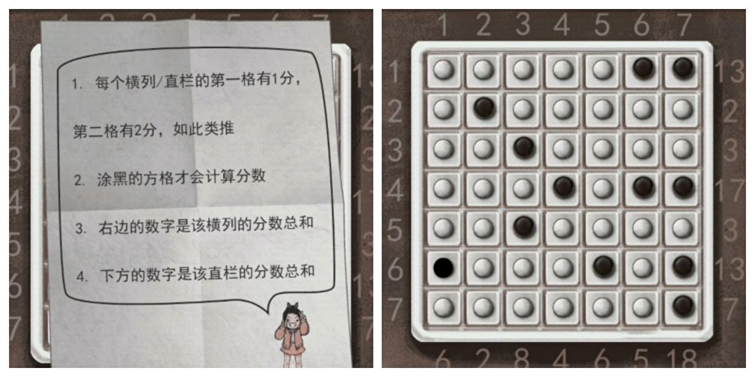 第六章棋盘我的破局思路:按和从小到大的顺序依次解,也就是从第2行/列开始,第2行/列除了2以外1~7里没有数字相加能得到2,那么这一行/列除了2点亮,其他数字都可以划掉排除,和为3时因为第三行的2已经被划掉了,排除1+2,只能为单独的3,同行其他划掉,同理解其他,越到后面就基本上没有数字了,很好排除