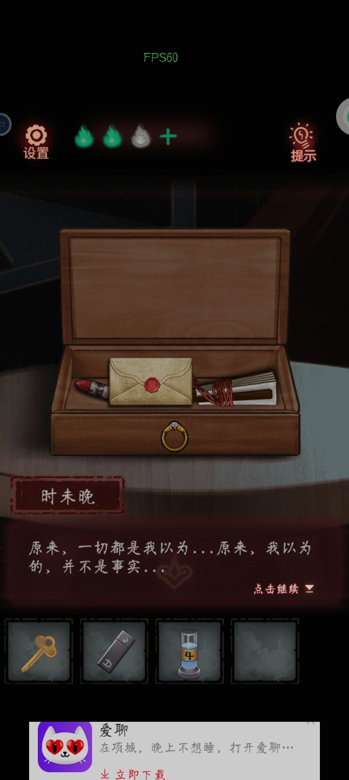 第六章:未晚的回忆1.点击左侧的书桌,把台灯转向右侧书桌,打开台灯2.点击右侧书桌,点击画,根据《论古代乐器》的内容用【毛笔】连线,获得线索(连线交点从上到下:321235523)3.(房间2-右边场景)点击架子上的照片,用【梅花起子】弄掉螺丝,拿走照片,在相框上获得线索(蝴蝶兰-三只蝴蝶🦋)4.把【古琴】放到桌子上,根据画上的线谱弹琴:3212355235.触发剧情,获得【电动车钥匙】