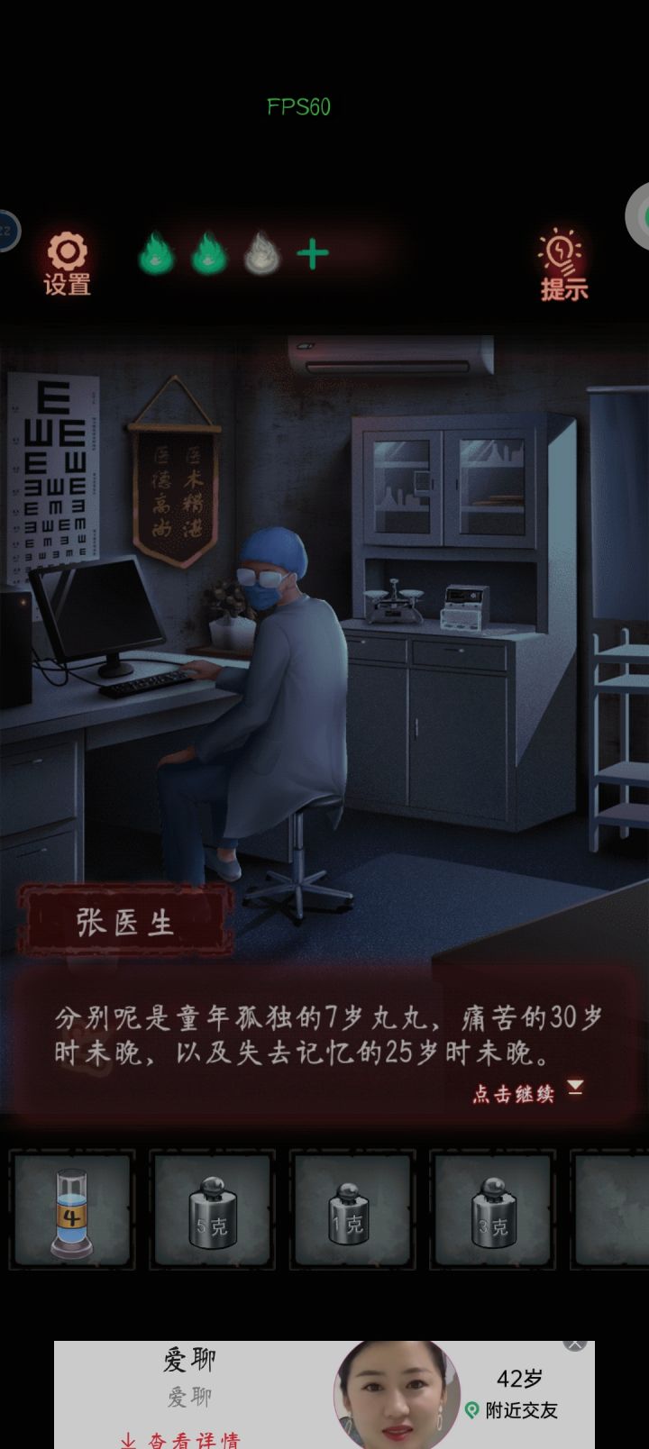 从垃圾箱中拿到遥控器,用遥控器打开屏幕会得到线索,向左转三圈向右转三圈(要连续不要停)观察护士弹试管的频率得到密码(注意间隔)看心理治疗室的人偶照片,然后调整404房间的八音盒上的人偶。前四章攻略看迷失攻略组的贴子https://www.taptap.com/topic/19974357