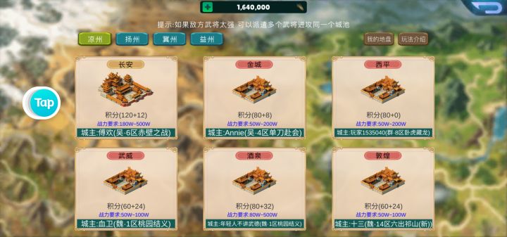 新一天的攻城战报来了!!马蹄迅千里,烽火席万城!昨日四国局势还颇为僵持,谁曾能料想,须臾间已是城头改换大王旗的景象。先让我们看下目前4州24城的割据情况:截止今日23时,👇【凉州】👇凉州王城长安【吴•傅欢】粮草重镇酒泉【魏•不讲武德】👇【扬州】👇扬州都城建业【群•魔神】粮草重镇庐陵【吴•塞纳小哥】👇【冀州】👇冀州都城河间【魏•小晶豆豆】粮草重镇肃宁【魏•曰黄昏以为期兮】👇