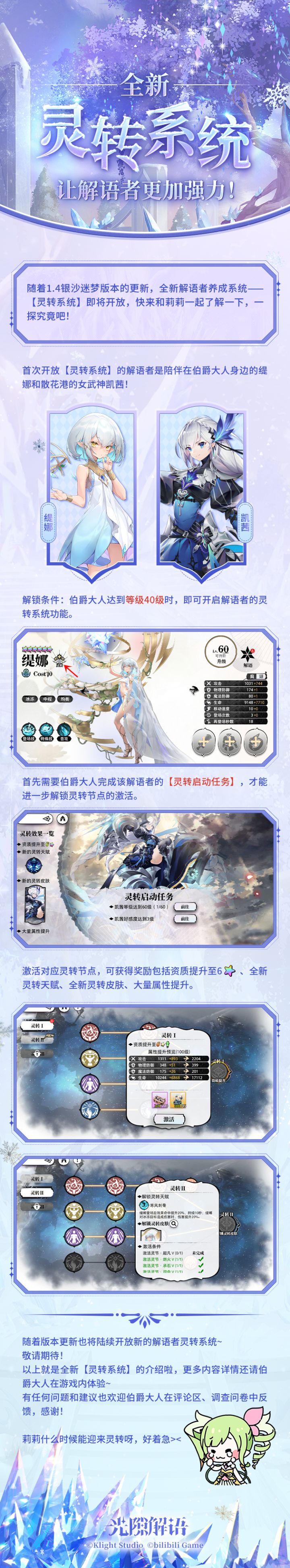 随着1.4银沙迷梦版本的更新,全新解语者养成系统【灵转系统】现已开放,快来和莉莉一起了解一下,一探究竟吧!评论本条帖子,将抽选5位伯爵大人送上【官方周边文件夹】1份哦!▶▶官方联系通道◀◀官方客服:https://game.bilibili.com/sdk/cs-pc/官方Q群:926809335 795402247 796570658快来和其他伯爵大人一起交流经验吧~