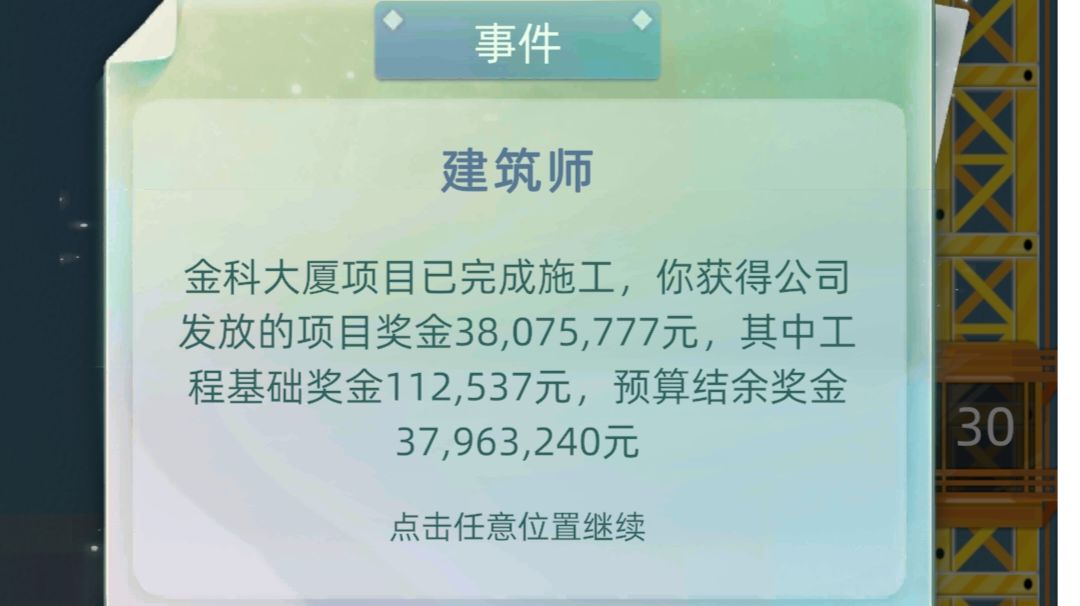 不确定会不会比演员赚钱,但是绝对比一般职业赚钱 首先得确保一定要考上高原建筑大学学校,只有考上这个学校才可以当建筑师 首席建筑师是最高职位 其实这个职业最赚钱的不是薪资,而是项目完成后的奖金 其中两年一个周期 第一年是设计方案,建议不用看预算,无脑选择层数高的就好了 如图所示只要所有数值都达标即可,建议选择后面几个 主要是前面几年的方案比较难做一点,就要看数值合理分配,实在不能达标我之前有一项差一