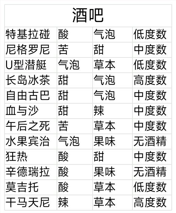 情商必刷:酒吧: 特基拉碰- 酸 -气泡-低度数 尼格罗尼- 苦 - 甜 -中度数 午后之死- 苦 -草本-中度数 U型潜艇-气泡-草本-低度数 水果宾治-气泡-果味-无酒精 长岛冰茶- 甜 -气泡-高度数 自由古巴- 甜 -气泡-中度数 血与沙 - 甜 - 辣 -中度数 狂热 - 酸 - 甜 -中度数 辛德瑞拉- 酸 -果味-无酒精 莫吉托 - 酸 -草本-低度数 干马天尼- 辣 -草本-