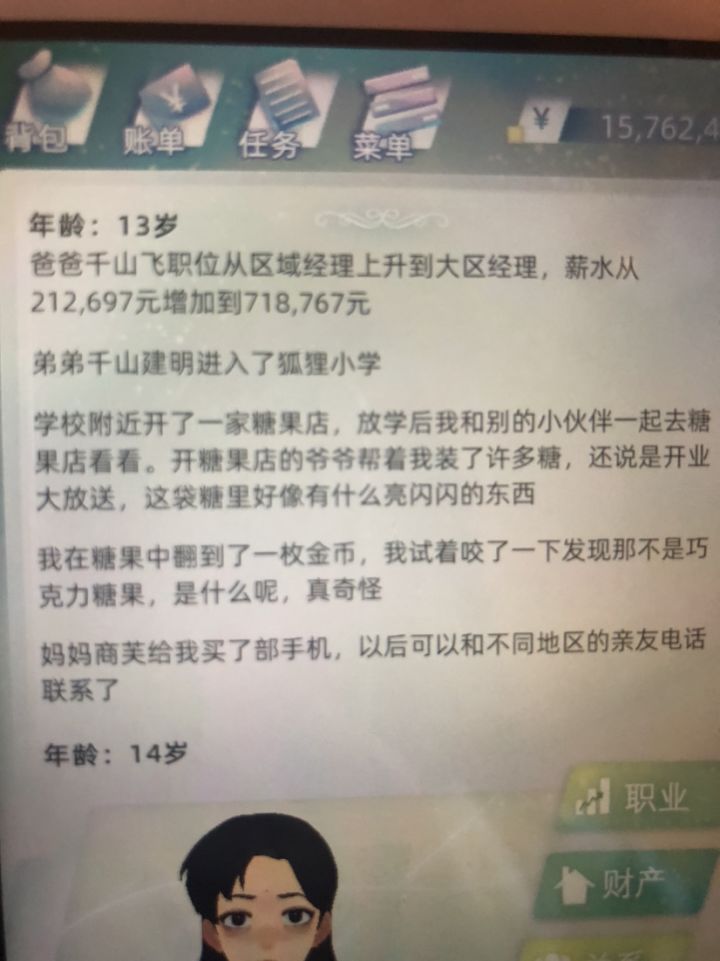 我有一次是我29还是30岁的时候,妈妈介绍了个相亲对象,工资非常低,红条而且只有一点,我觉得她太穷了,是个众包骑手,我想傍富婆躺平来着,所以不想和她交往。但是她好像对我一见钟情,第一年见面,第二年就给我表白,我不好意思拒绝就答应了,想着答应完再分手就好,但是我第二年点分手系统说“xxx不想和你分手,你们聊了很久,解决了彼此之间的问题,又和好如初了”……我就?然后也不好意思再点,想再等一年吧,结果下一年人家直接和我求婚,我忽然就一身负罪感。因为她只是工资低,我当时应该算工资黄条的人,每年还在加薪,我其实自己也能过好日子没必要非得找个有钱人,我主要第一次在游戏里遇见主动表白求婚还不想分手的,人家还是女孩子,我虽然这局是男号但我现实也是女的,现实要有这种女孩对我痴心不改我还一直为了钱拒绝人家我都觉得我不是个东西。所以我赶紧同意了然后主动结婚,和她过了一辈子。说实话她是真穷,后来换了个工作,工资条涨了许多但还是穷。买房的时候我85%她15%她说支付不起,我只好又攒几年钱全额付款。退休后我去女儿所在城市定居了,她居然没车票过来 ,问经济状况说入不敷出,我给她汇10万她还是没钱。我考虑了一下,我们退休后我是卖了当地房子走的,准备到女儿所在地买个房子也方便遗嘱继承,我们老两口再迁个户就行。结果千算万算没想到她没钱了,我觉得应该是我走了房子也卖了,她应该是租房的,她工作工资就不高,退休后不可能高,可能水电物业房租付不起,而且年年欠费,所以我每次汇过去的钱还是太少了,我就又坐车回去把所有钱都给了她,7、8亿吧都给她了,就给自己留了个车票钱。这回我去找女儿以后叫她她可终于来了,然后我们一家三口就继续一起生活了✌️。我觉得遇到这种喜欢的真的很美好,因为她虽然没钱,但经常给我送礼物,我们结婚以后每个年龄段她都会送我衣服,我一般都是穿她送的衣服。她平时还会送手机耳机和养生茶什么的,经常和我去吃饭旅游健身步道。我们的孩子刚出生对我的好感就很高,小孩子真可爱啊,有一年系统显示老师说孩子上课睡觉让我管管,我晚上见孩子房间有光,有三个选项我选了悄悄看,发现孩子在叠纸星星,然后系统显示原来孩子是给我做生日礼物“一罐纸星星和一张写着生日快乐歪歪扭扭字的纸条”,我当时特别感动。我以为这只是一个小剧情,后来有一回妻子送我礼物我就点进背包看了眼,发现真的有罐纸星星,应该是我孩子送的那个。当时系统也不提示,害我好久之后才知道,而且纸星星点了后它的介绍是“不是所有人都可以得到纸星星,它是幸运的象征什么的”,这个好像商场有卖,但我孩子叠的意义就是不一样啊。啊啊啊啊,我太激动了,我太爱了。这个游戏最好的地方就是经常有亲朋好友送礼吃饭等互动,每次我孩子送我礼物我都好高兴。小孩子没什么钱,会给我送可乐送薯片还有奶糖,还有女儿自己做的手工曲奇,呜呜呜,我都舍不得卖,收到礼物真的会很高兴很高兴,我全吃了呜呜呜。我真的在里面玩的非常开心,这个档真的特别如意。我们只有一个女儿,我的遗嘱继承人是我妻子,我们一起生活真的真的非常美好