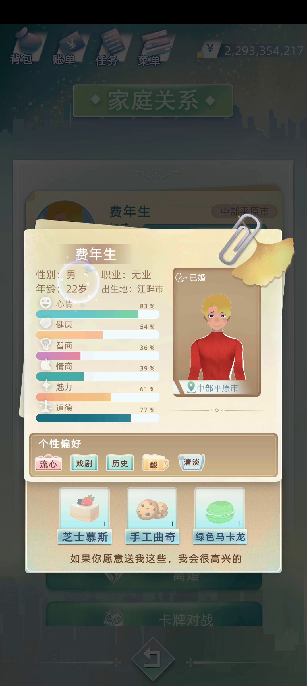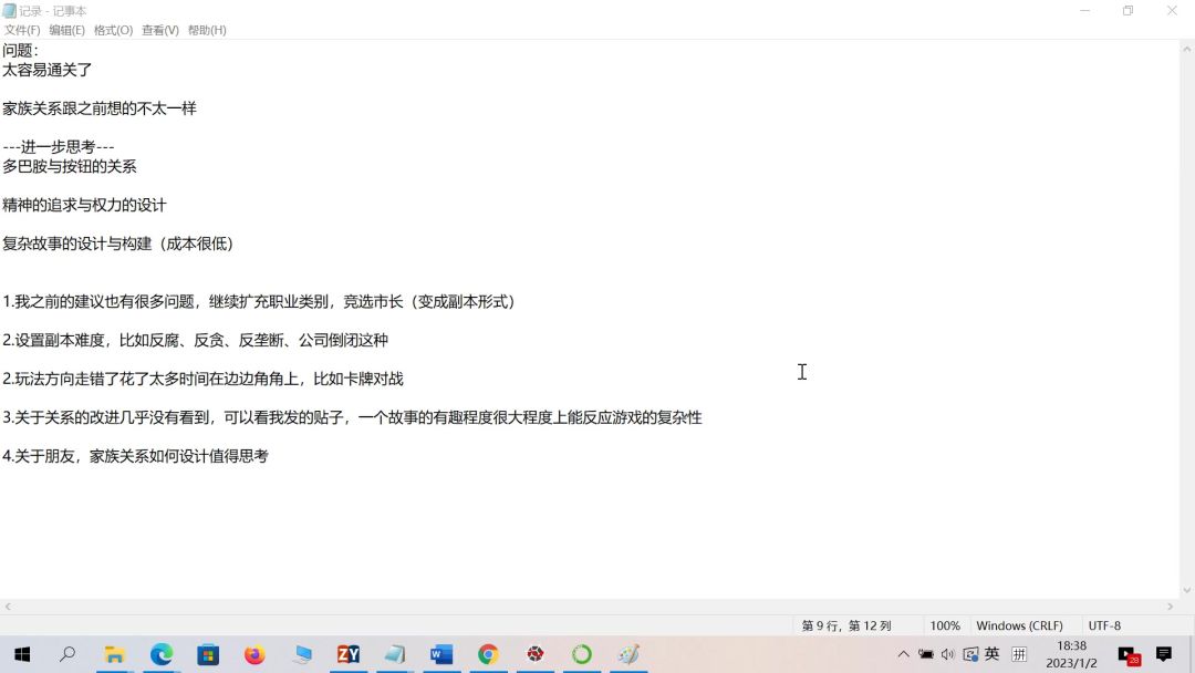 我十分喜欢这个游戏,希望策划能把这个视频转给架构😁 参考代码如下: 随机生成朋友方法 def makefriend(): import random global age friendage = 35 person_level = random.randint(1,5) person_classfiy = random.randint(1,8) Favorite = random.randint(0,100) import numpy as np # 社会关系就可以算到朋友影响力去 # 值 = 随机变量*社会阶层*好感度+年龄量*随机变量 return person_level,person_classfiy,Favorite*person_level*random.randint(100,300)+random.randint(100,300)*1/np.abs(age-friendage) 玩家person类 class person(): def __init__(self, name,loc = '东海岸明珠市', **kwargs): self.money = 3000 self.name = name self.mood = 70 self.health = 70 self.iq = 70 self.eq = 70 self.face = 70 self.morality = 70 self.famliylist = [] self.loc = loc #下面是隐藏变量 self.personlevel = 3 self.person_classfiy = 1 #家族的classfiy可以用树结构去保存,这里只打个比方用最简单的列表,用树结构可以计算不同层间的距离 self.famliy_classfiy_influence = [1,3,5] self.Family_influence = [100,2000,300] #1.公益捐赠2.上交税收3.带动就业4.消费贡献等等等 self.person_influence = [2000,500,400,1000] self.friend_influence = [] self.friend_level = [] self.friend_classfiy = [] def caculate_person(self): #个人总影响力包括颜值什么的乱七八糟都可以算进去 return np.sum(self.person_influence)+self.personlevel*1000+np.sum([self.money,self.iq,self.eq,self.face]) def interact(self): #展示如何与朋友交互获得 p_level,p_classfiy,friend_infulence = makefriend() self.friend_level.append(p_level) self.friend_influence.append(friend_infulence) self.friend_classfiy.append(p_classfiy) pass def inherit(self): #继承家族的影响力,继承朋友的关系,必须在下一代要继承到 #这里可以计算公式什么的 pass def other_func(self): pass