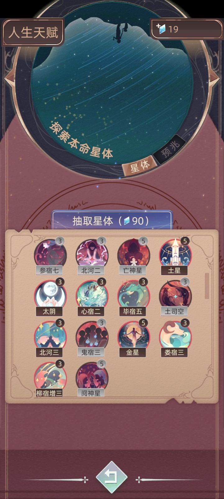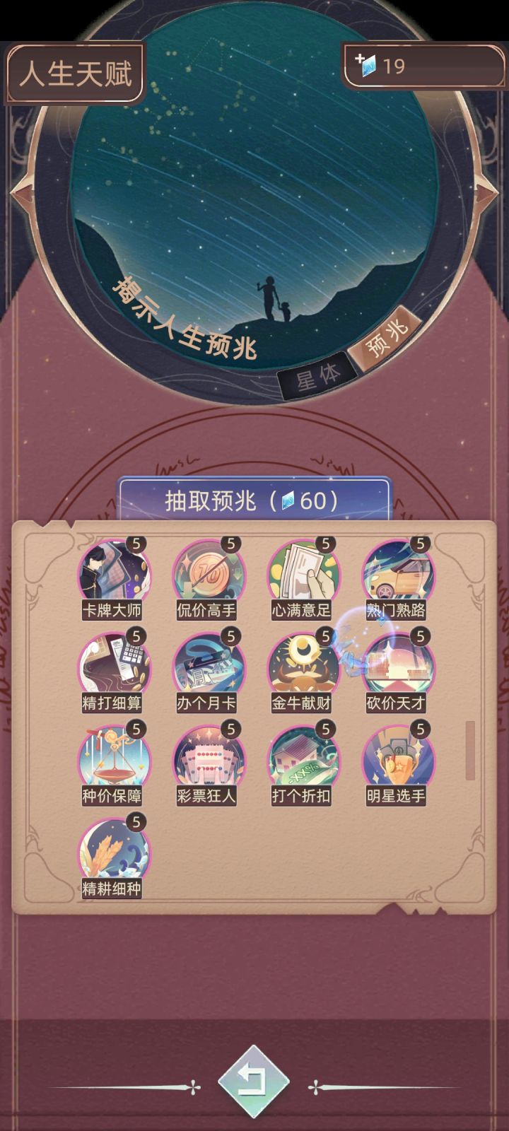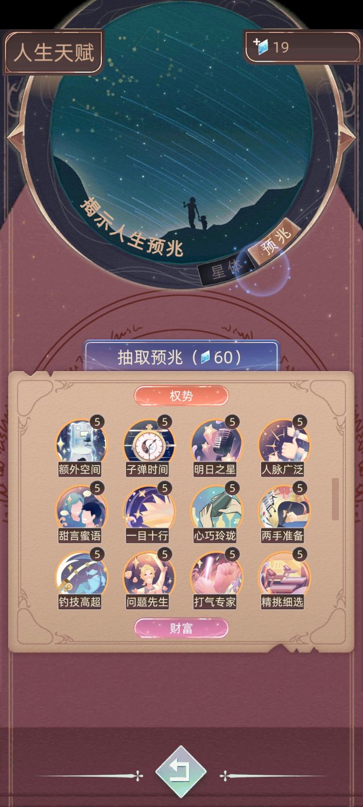 截至2025.08.25,目前游戏多更新的所有天赋都在这了。其中包括14个星体,12个权势,13个财富和10个命运。第一发天赋必中不重复的情况下需要60钻石,非常非酋的话就是一个天赋连抽四次都重复了,每重复一次就回返还42钻石,所以得出49个天赋总抽所需钻石=60+[(60-42)×4+60]×48=6396每升一级所需钻石为30个,满级为5级的天赋有39个,剩下的10个满级皆为3级,全部满级