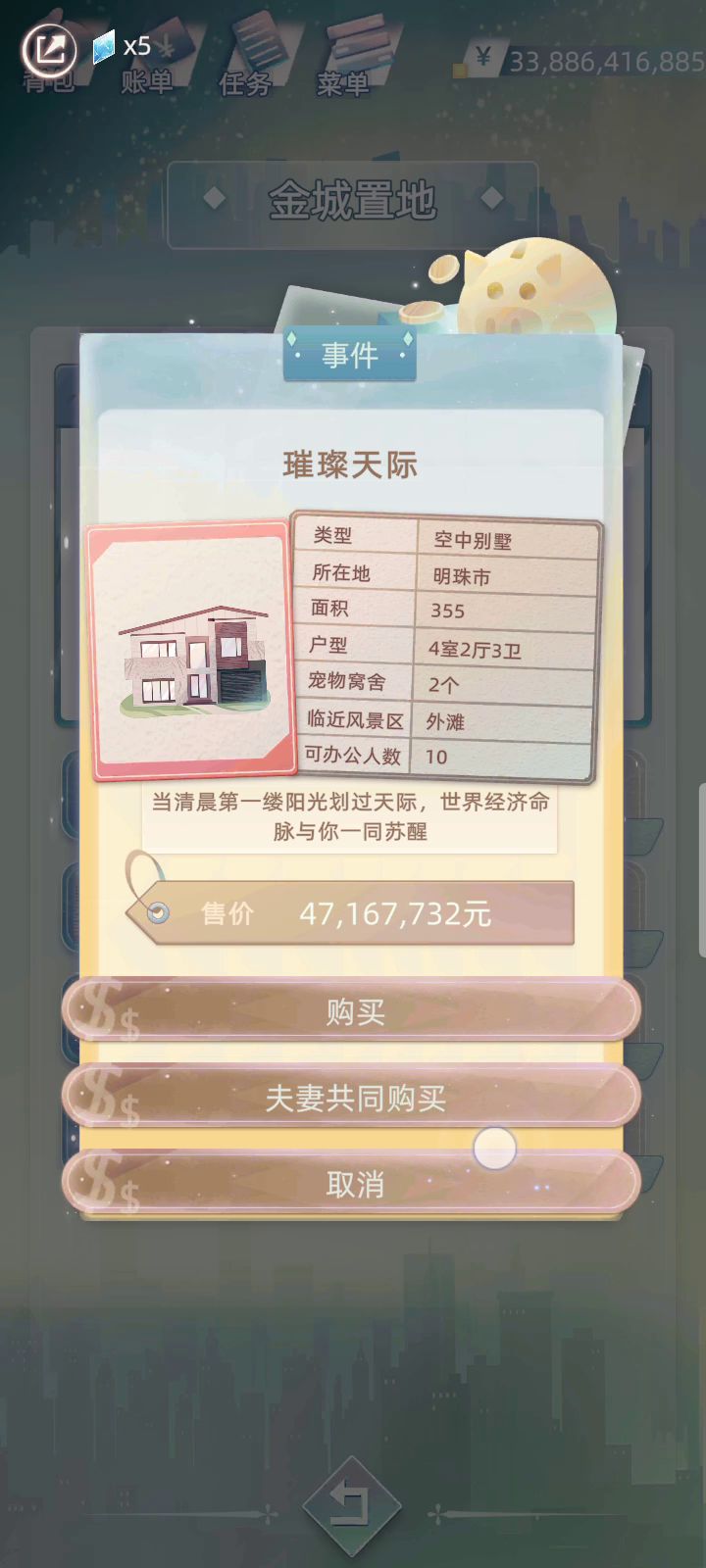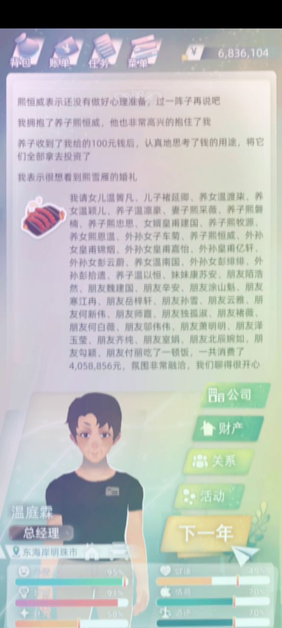 我看好多人还在问公司怎么开,就临时开了家公司,这是前期员工天赋还不怎么好等他们吃福利天赋上去了轻松8亿多虽然员工会退休但是还是能赚好几次8亿了到最后不济也有6-7亿(最好只跟咖啡合作!)不然会自动找其他合作但问题不大只是少赚一年而已。公司到最后七八十岁了去工商局一结束运营上面的钱全部到自己口袋传给下一代生活直接美汁汁。(但是这么做)之后存银行吃利息游戏直接没有乐趣了。😏