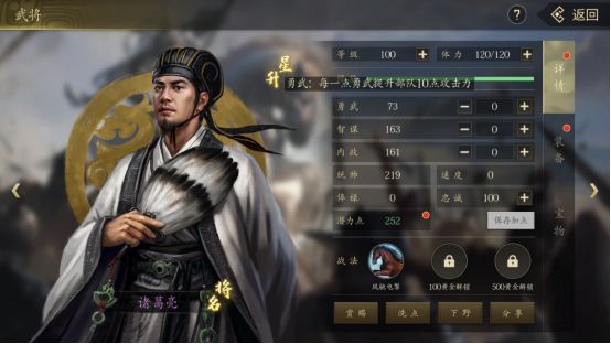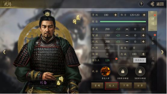 在游戏中玩家可对将领进行洗点,进行洗点时需要消耗道具“洗髓丹”,洗髓丹可以通过商场购买、活动赠送、野地掉落获得。在对将领进行第一次洗点时会将武将的初始勇武、智谋、内政属性点根据固定的百分比转换为潜力点,同时也会根据将领等级转换为对应的潜力点。因此当将领升级至满级后在进行洗点可以最大化获得潜力点潜力点。此时玩家可以将洗出的潜力点主分配到单项属性上,这样将领可以在单属性上发挥最大的用处,如果玩家潜力