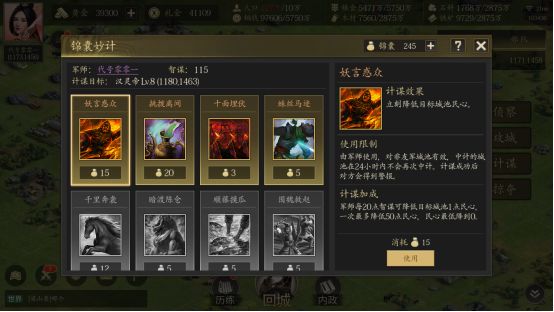在游戏内可以对城池、部队使用计谋,造成各种效果。使用计谋是需要委任军师,当军师的智谋越高时计谋发挥的效果也就越高,使用计谋还需要消耗道具“锦囊”,锦囊可以通过商场购买、活动赠送、任务里获得。当对玩家城池使用计谋时,会根据使用城池内的长史比较智力,若军师智力低于城池长史智力,那么使用计谋会有概率失败;若是对部队使用则会跟部队将领进行比较智力,若军师智力低于部队将领时,使用计谋也会有概率失败。游戏
