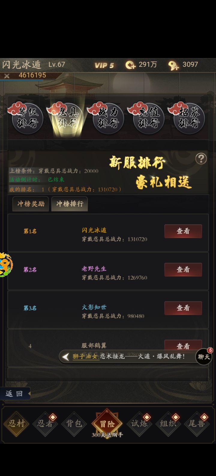 第一步加群 590090861群公告最后一个领取礼包码兑换是首充(做完新手教程再兑换好像有bug没做完兑换领取不到第七班)首充送一个忍者礼包选红佐助第二步快速注册账号进入游戏第三点左侧悬浮窗口设置个性账号密码以防账号丢失第四开始搞!先培养送的红佐助每次过关到等级卡关就快速一次不要拿勾玉买高级招募没必要浪费(在混排行榜忍者上阵等级的时候可以5个平均养,不混或者排行榜结束建议所有资源