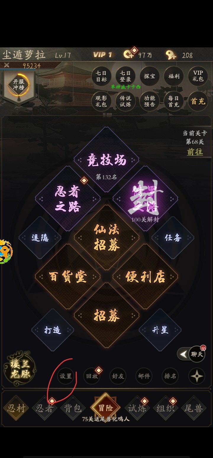 这游戏其实就和剑远,小浣熊百将传,还有前段时间一款广告暴多的一款火影手游的模式基本一样,区别在于这款游戏没有酷炫的打斗和建模,当然最大的区别是这款游戏你氪不了金!!!如果玩过类似模式的朋友应该可以很快上手。首先进入游戏之前先加官群,在群公告最下面有兑换码,然后进游戏过完新手指引,在忍村—设置里把兑换码礼包领了。领了后就可以领首冲礼包,三个忍者个人建议选尾兽鸣人,因为主线推到75关有送尾兽鸣人,因