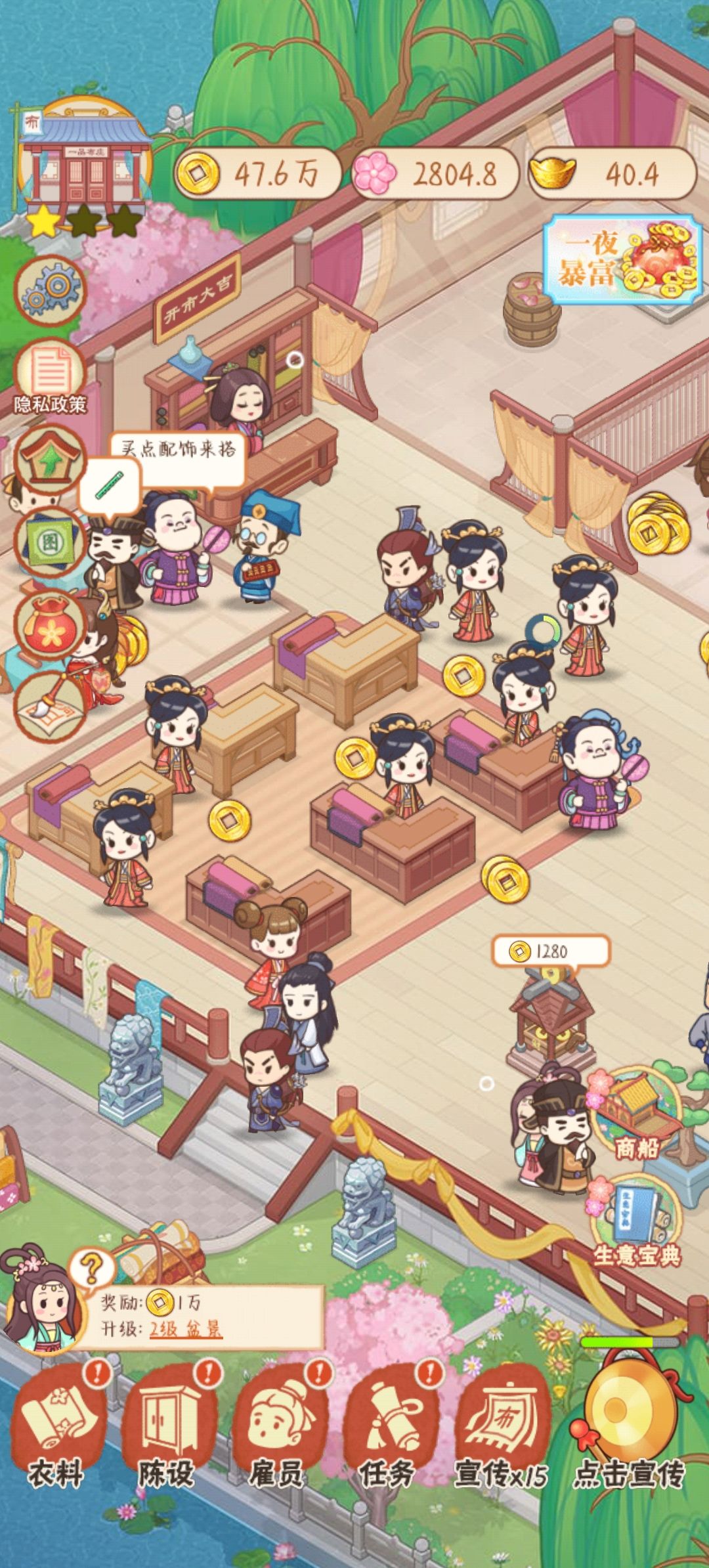 一品布庄是一个挂机挣钱的游戏,你要通过挣钱才能解锁跟好服饰,那么钱从哪里来呢?当然是招揽顾客还可以做任务,顾客可以宣传,然后顾客们就可以来你店里买布料,赚的钱可以摆放部件,也可以雇佣店员,画风也特别吸引我,推荐大家入手
