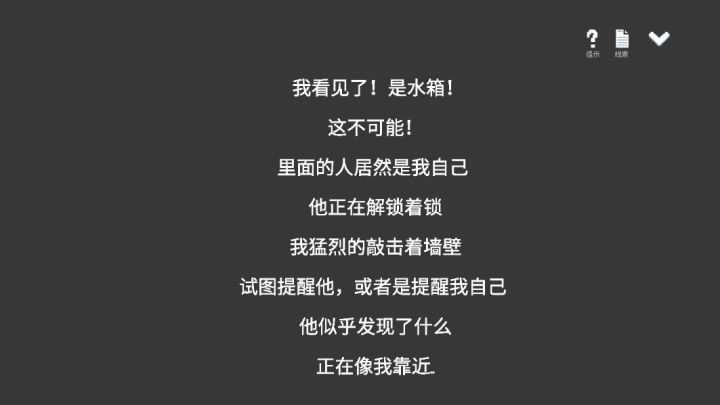 几个结局之间的细微差异使得对处于水箱中的我的刻画更为耐人寻味。当我再一次给实验设备插电,我陷入到无穷无尽的循环中,无法分清这里是现实还是实验,类似于盗梦空间中梦的嵌套——不同的是这次连作为锚点的陀螺也没有; 当我选择溺死其中,便如同温和的走入那个良夜,接受了环境对我的桎梏,但又表现出最终承认无法逃脱某种悖谬的释然——我接受了水箱给我的一切,我属于水箱; 当我在放弃与不甘中挣扎,在两个极端中游走,我已趋近于疯狂——那么,你是否选择面对真相?颇为戏谑的是,或许并没有这样一个所谓的真相——因为即便没有在最后时刻选择观望,而是毫不犹豫的摧毁它,得到的依旧是那个答案——你属于水箱,你无法脱离环境超越你的认知。