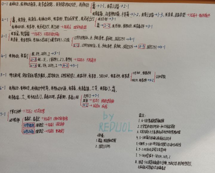 都写在图里了,基本可以完全抄作业,建议自己先慢慢玩看了游戏内的提示后实在卡关或时间线有地方不知道怎么解锁再来看写的时候比较急,字挺丑的,抱歉啦,不过看懂应该没啥问题()有些一个字写在另一个上面的就是这样,类似砸箱子和站椅子上游戏流程不长,我陆陆续续玩了一天就通关了感觉第三章的电脑5密码和汇附回收站那里好难想到,不看提示可能试不出来然后第五章查文件那儿最容易闪退,不过重进后就好了图中重