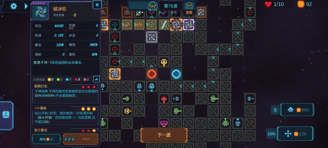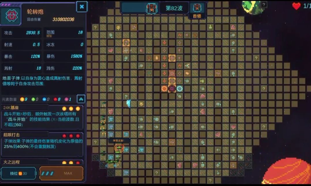 粗略的看了一点电脑版的攻略,挺详细的,不过电脑版和手机版的是有差别的也不能照搬,不过可以获得大量启发。 1.核心机 做为游戏输出核心我对于它的一些测试 24k词条可以触发核心机被动技能,不过范围依然是1格,只是重复计算了2次加伤。所以有科技核心机+1范围的最好拿了,效果不错。 (ps:昨天打的无尽模式打到一半,然后今天继续,从50几关到70关前还没问题,到了70关就开始出bug。所以炮台只转圈不攻