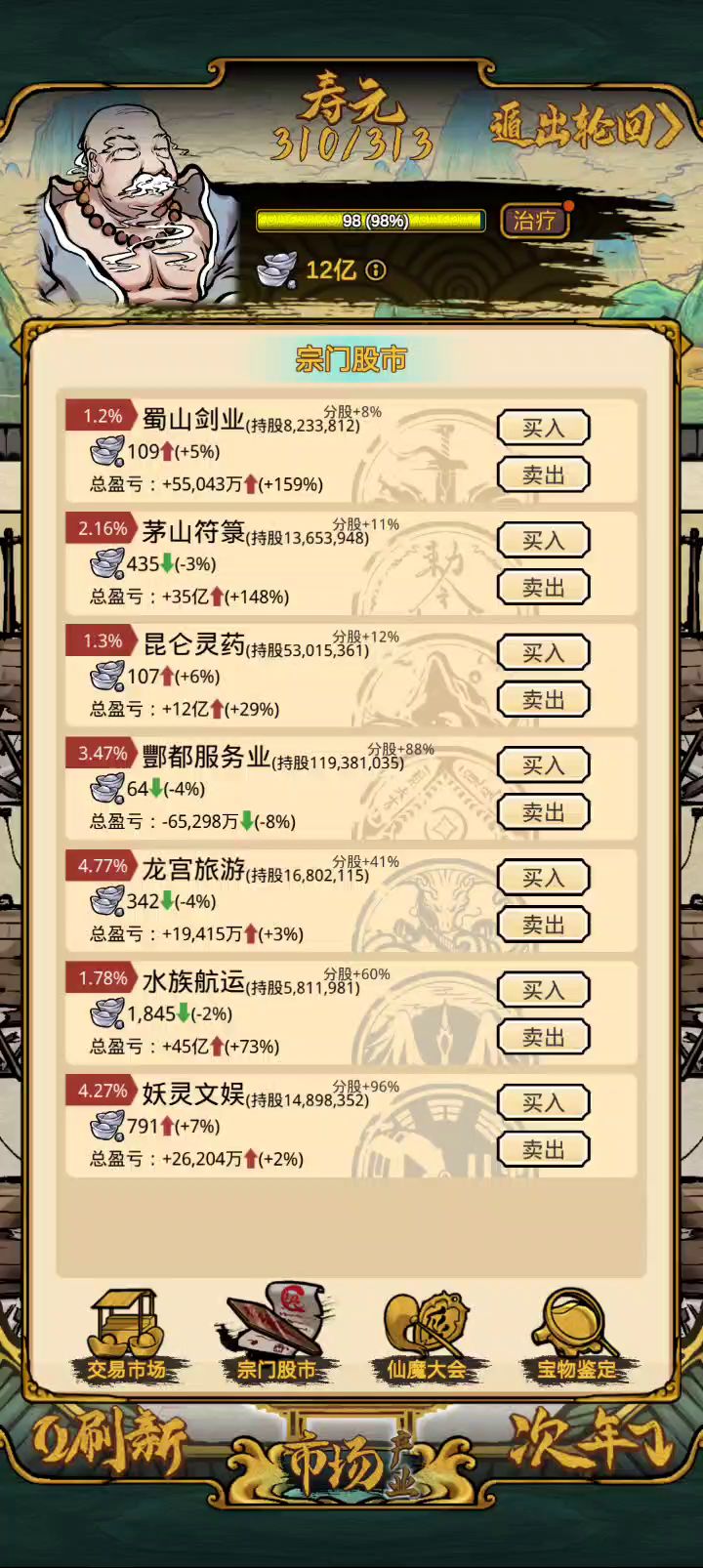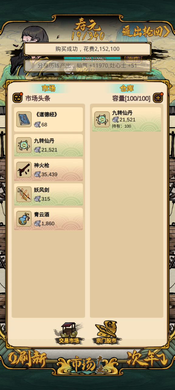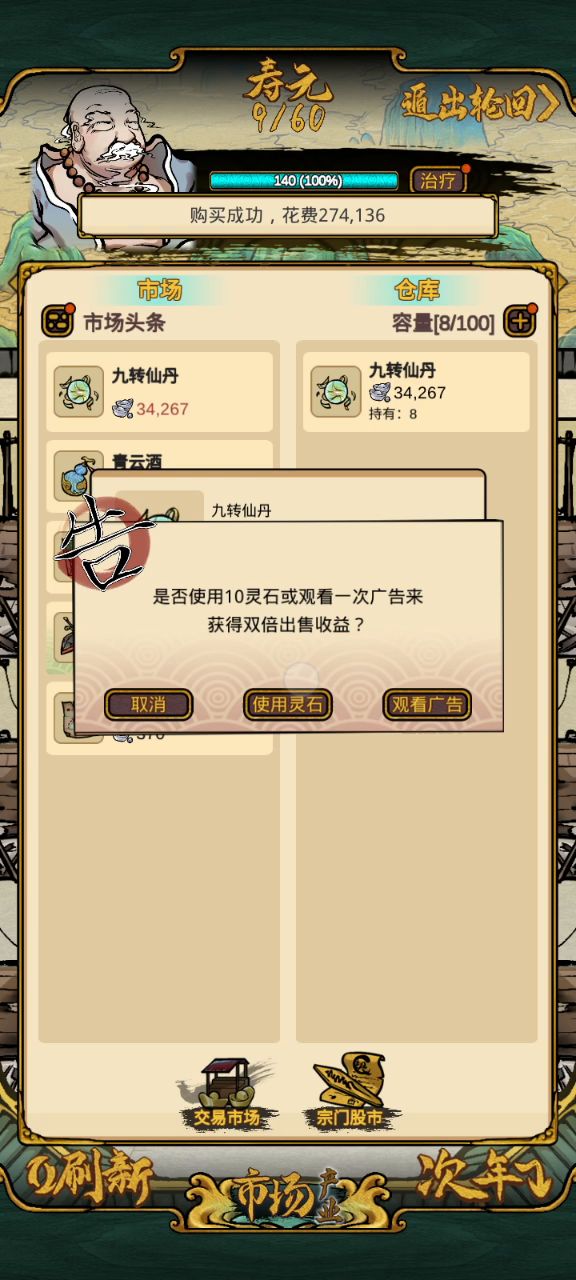 从最开头开始讲,目前制作方可能没有找到广告插入,所以用广告无限刷双倍卖出是最快的。 核心思路是: 开场挑1k-3k的东西卖,卖满一百进入下一个阶段,5k-1w,不推荐跨度太高,比如开场就卖3w的,实际上效率没有前者快。 建议在第一年就把仓库增加到200,然后开始刷,刷,不断下一年,没有暴涨的仙丹就直接下一年。 有了就开始刷,中间可以把仓库增加到300,然后资金到2亿就点下一年,宝物鉴定就开放了。 五百万可以让仓库增加到200,两千万到300,300个仓库足够你刷到宝物鉴定。再多没啥意义。 然后说宝物鉴定。50%以上的几率就可以动手刷,购买价3亿以下的我不予考虑,比较浪费时间,尤其是有了八卦帆以后,和仙丹操作差不多,三分钟之内就可以刷到101亿,然后收工回家了。