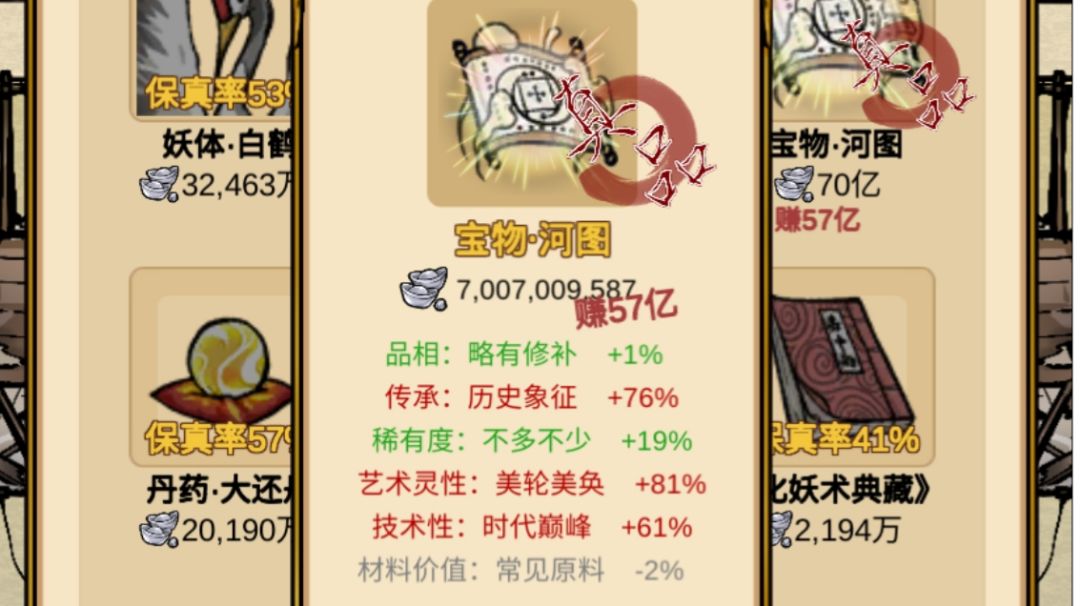 思路开启鉴定,然后搞河图,膨胀的很快,古玩只开50以上的。就是低概率真的很难赚,时间成本反而变慢了。 最高一次河图赚了57亿,基本上3个河图差不多就够101亿了