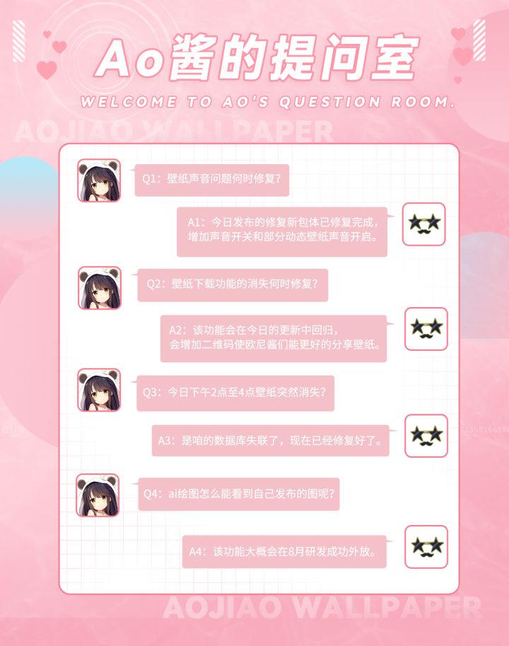 亲爱的欧尼酱:Ao酱先代表《傲娇壁纸》制作组向各位欧尼酱说一声抱歉,ai聊天新功能还处于测试阶段,可是我们的程序员们却先一步病倒了/(ㄒoㄒ)/~~,也请欧尼酱们在疫情复发期间出门要注意防护,身体健康才是革命的本钱!不过还请欧尼酱们放心,Ao酱会做好传达的工作,将欧尼酱对新版本的建议与反馈如实记录,再将负责人的回复与修复周期传达给大家,我们会正视当前存在的问题,并去尝试解决。流量bug问题于