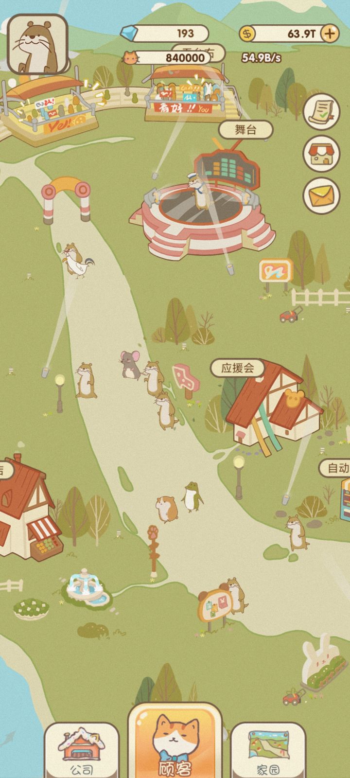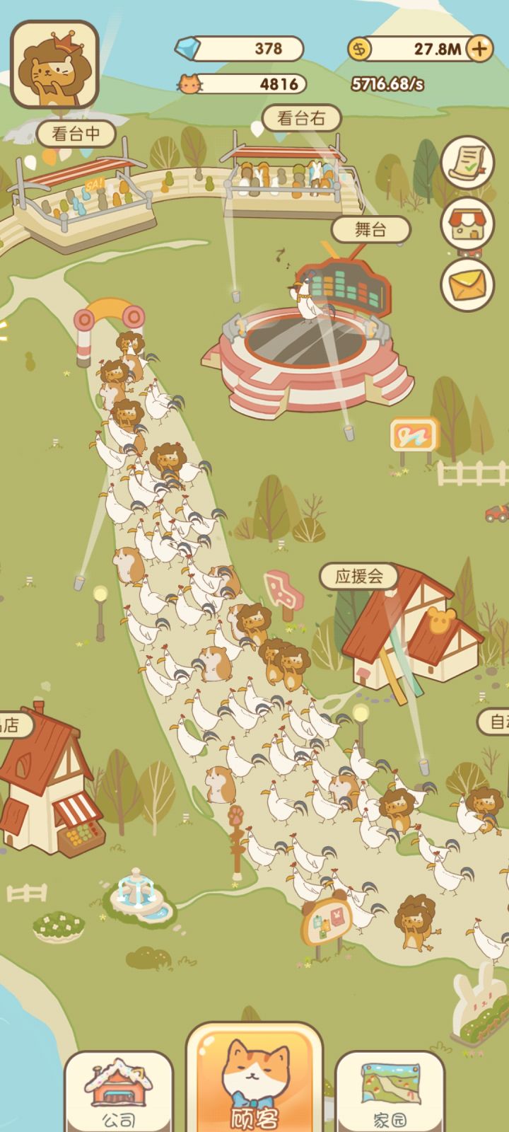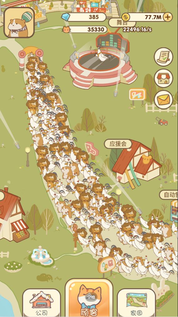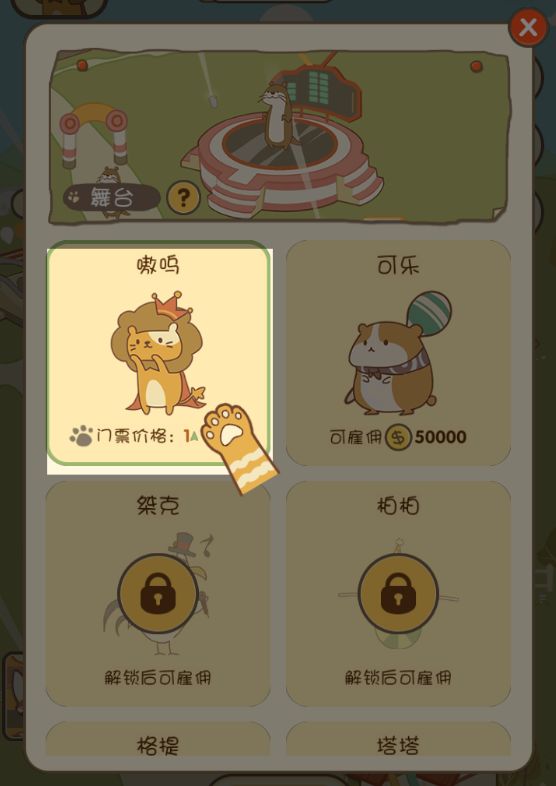 ヾ(o・ω・)ノ各位马戏团经理们,泥们嚎呀!是不是在经营马戏团的时候会苦于金币不够不能解锁新的明星动物呢?哼哼哼,今天,我就来带领大家一起走向致富路!登录游戏,开局就送巨星嗷呜,一秒999,走上人生致富路!( • ̀ω•́ )✧(打住!!)解锁嗷呜后,首先就是升级大门了,大门越华丽,我们的门票价格就越高哦。不过刚开始的金币是不够升级大门的,所以我们要先多多招揽观众,长按顾客按钮,嗷呜的粉丝们就
