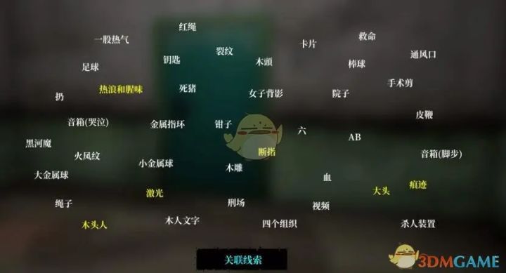 第一个箱子密码3783(地上的数字)第二个箱子密码5415(激光里看视频)1裂纹 地面上卡片 获得 裂纹1后 上方有四个符号的门上方门缝救命1+木头1+棒球1+通风口1=扔黑河魔1+火凤纹1+六1+AB 1=四个组织大金属球1+小金属球1+木雕1+血1+痕迹1+绳子1=杀人装置3刀 女尸屋子 右手边三个袋子右边袋子上奇怪图案(1/3)2+奇怪图案(2/3)2+奇怪图案(3/3)